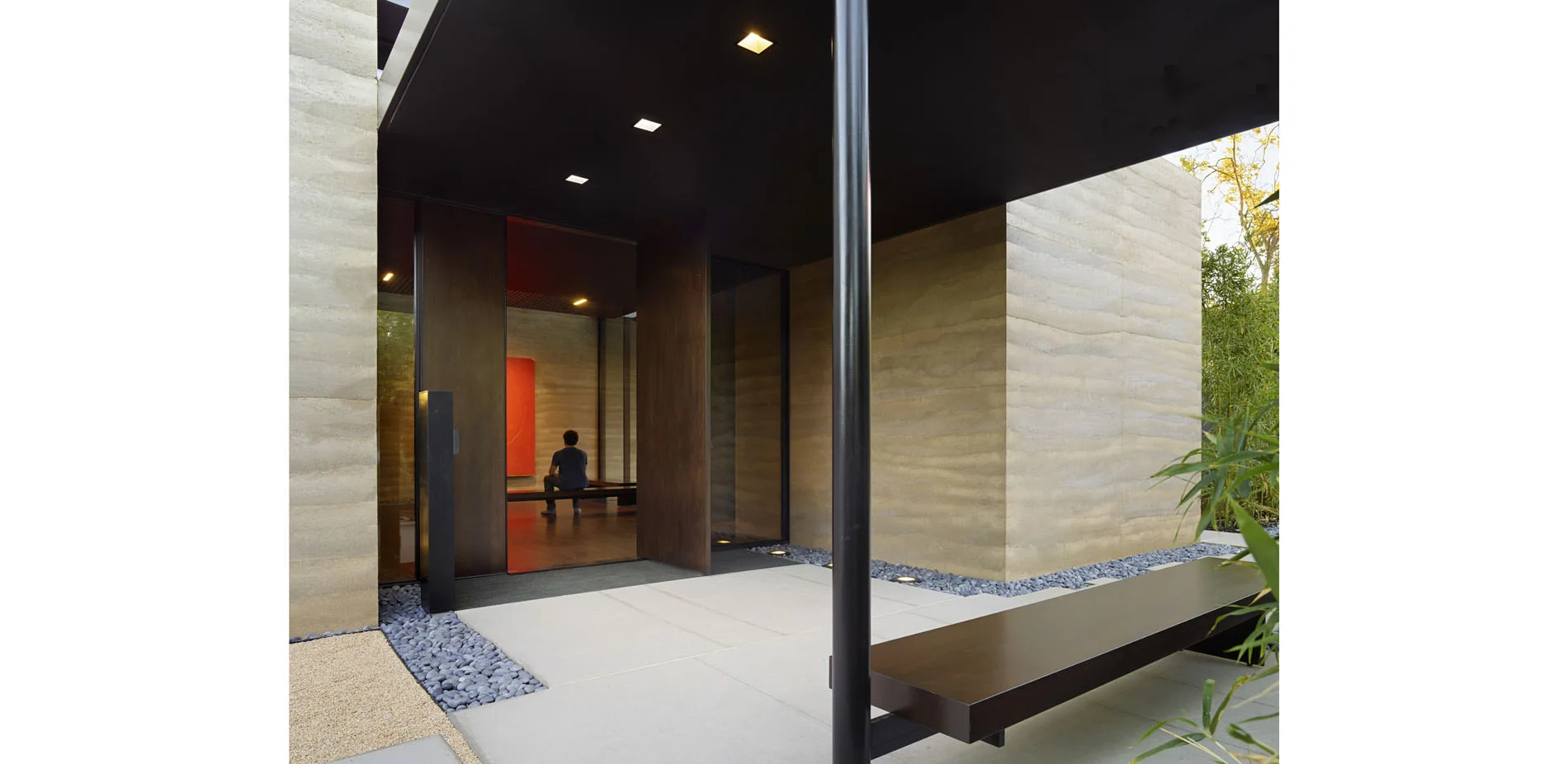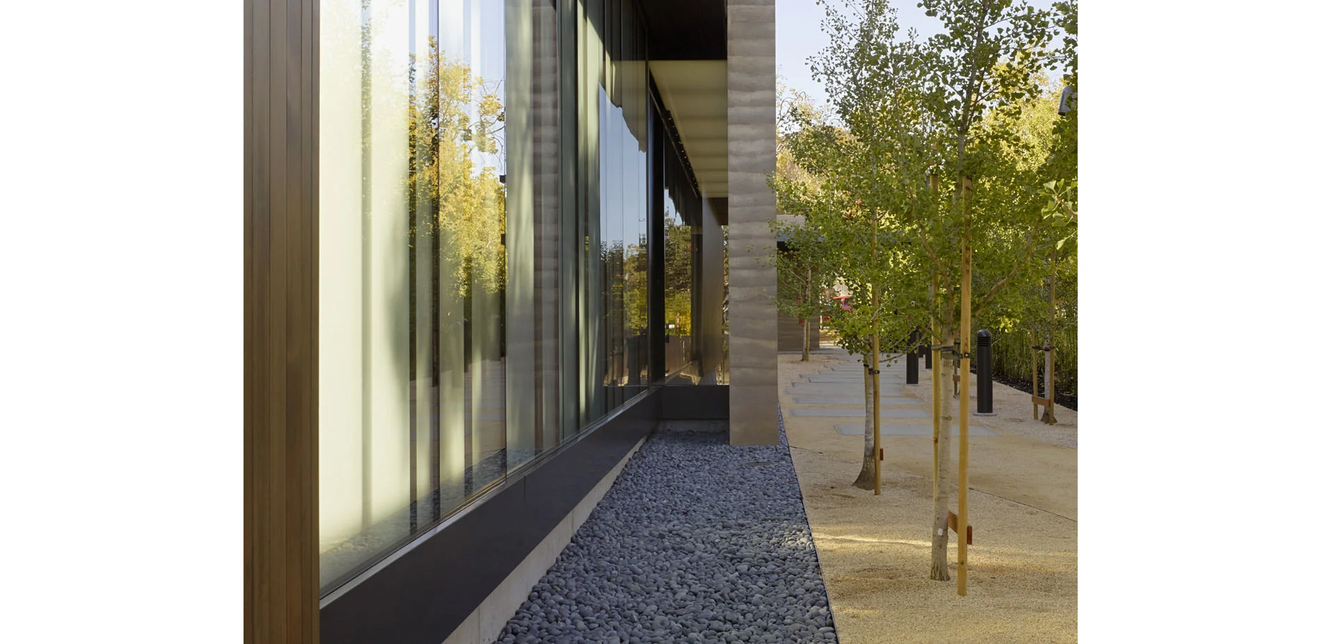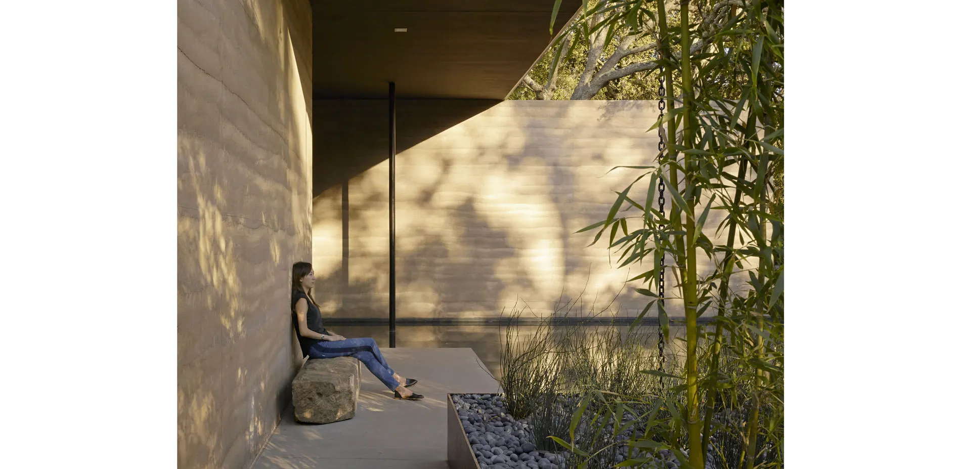 The project’s innovative materials palette reinforces the deep engagement with nature that is integral to the program and overall design concept for the complex. Rammed earth walls, weathered steel, stone, water, gravel and decomposed granite immerse visitors in a tactile environment. These materials amplify the experience of ephemeral phenomena, drawing visitors’ attention to the sound of stone crunching underfoot, the movement of the breeze across the water, the play of light and shadow against planar surfaces.