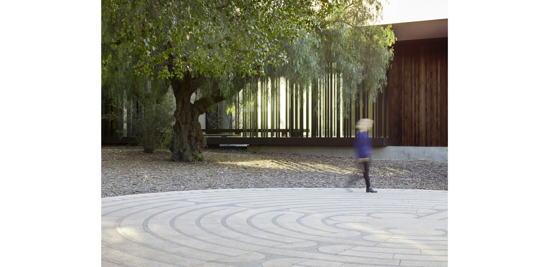The long, narrow building, on a one-acre site, is bounded by a major campus thoroughfare, a heavily used bike path, and a large dormitory. The carefully choreographed entry sequence provides an experientially rich transition between the bustling campus and the chapel-like gallery: a crushed stone path leads visitors through a grove of ginkgo trees and past a tall wall of bamboo, allowing them to shed the outside world before entering the center. Within the building, the interior spaces merge with a series of outdoor rooms intended for quiet contemplation. Wide panes of glass and vertical fins frame views back out to the woodland and courtyards. At the rear of the building, a still reflecting pool defined by a rammed earth wall, a weathered steel screen, and a stand of bamboo are designed to quiet surrounding distractions and turn visitors’ focus towards the ephemera around them. At the core of the building, a Zen-inspired courtyard opens to both the sky above and the adjacent oak woodland, offering views of a meditative labyrinth nestled among the trees beyond.