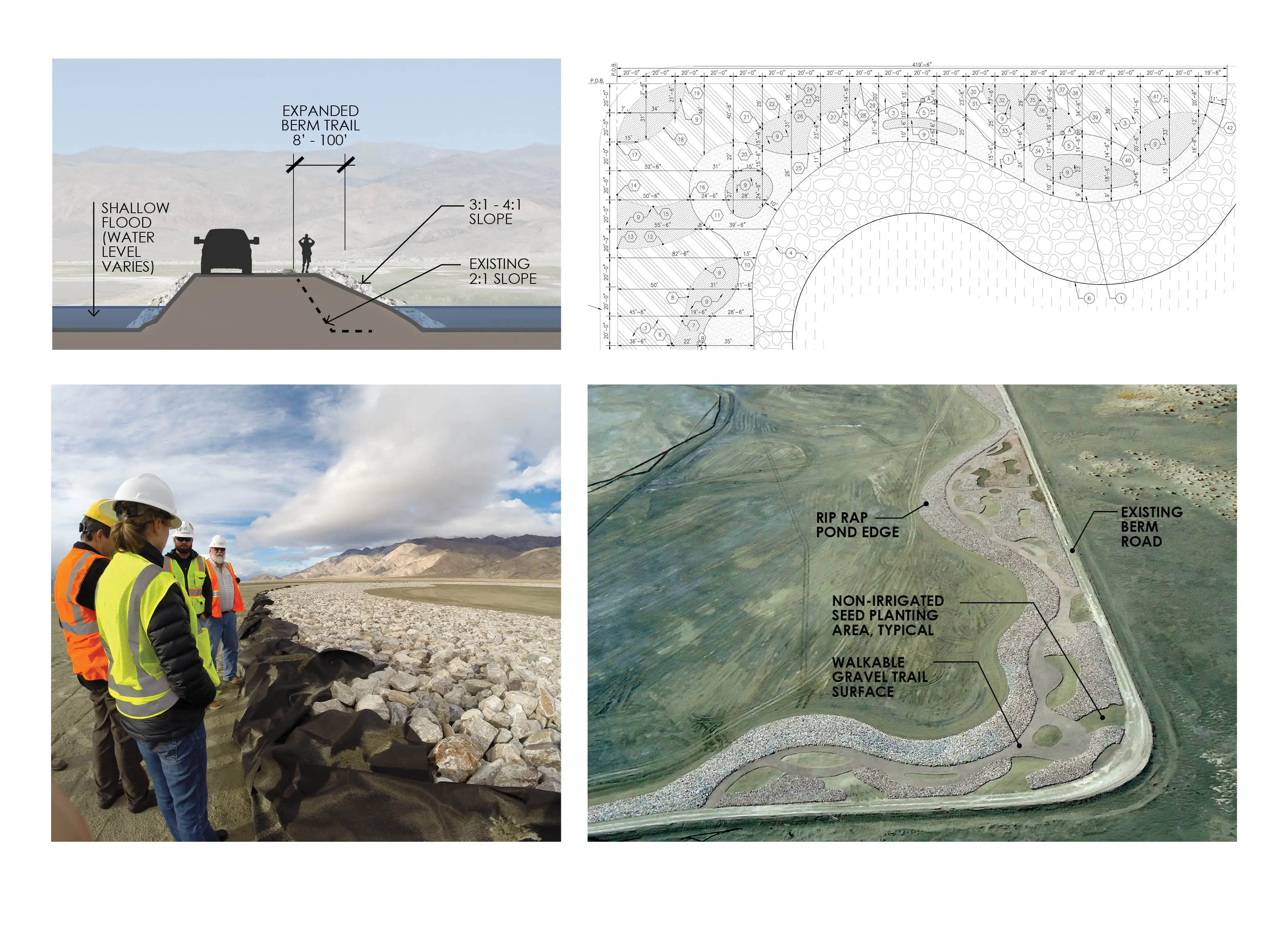 In order to meet the criteria of the dust mitigation agreement, the design had to adhere to specific compliance targets for each of the mitigation measures. 235-acres of shallow flood were required to be maintained so that 75% of each square mile produces standing water or surface saturation from October 1 through June 30 of each year as monitored via satellite. 407.5-acres of managed vegetation were to be planted as a mosaic of Dry Alkaline Meadow, Mixed Alkaline Meadow, Shrub/Dry Meadow native species. The remaining 51-acres (excluding the berm roads) were required to be made up of gravel or rock cover and small open spaces of exposed earth (no cover) scattered through the managed vegetation for habitat purposes. The resulting solution is a dynamic tapestry of native and local materials woven into forms which serve specific functions.