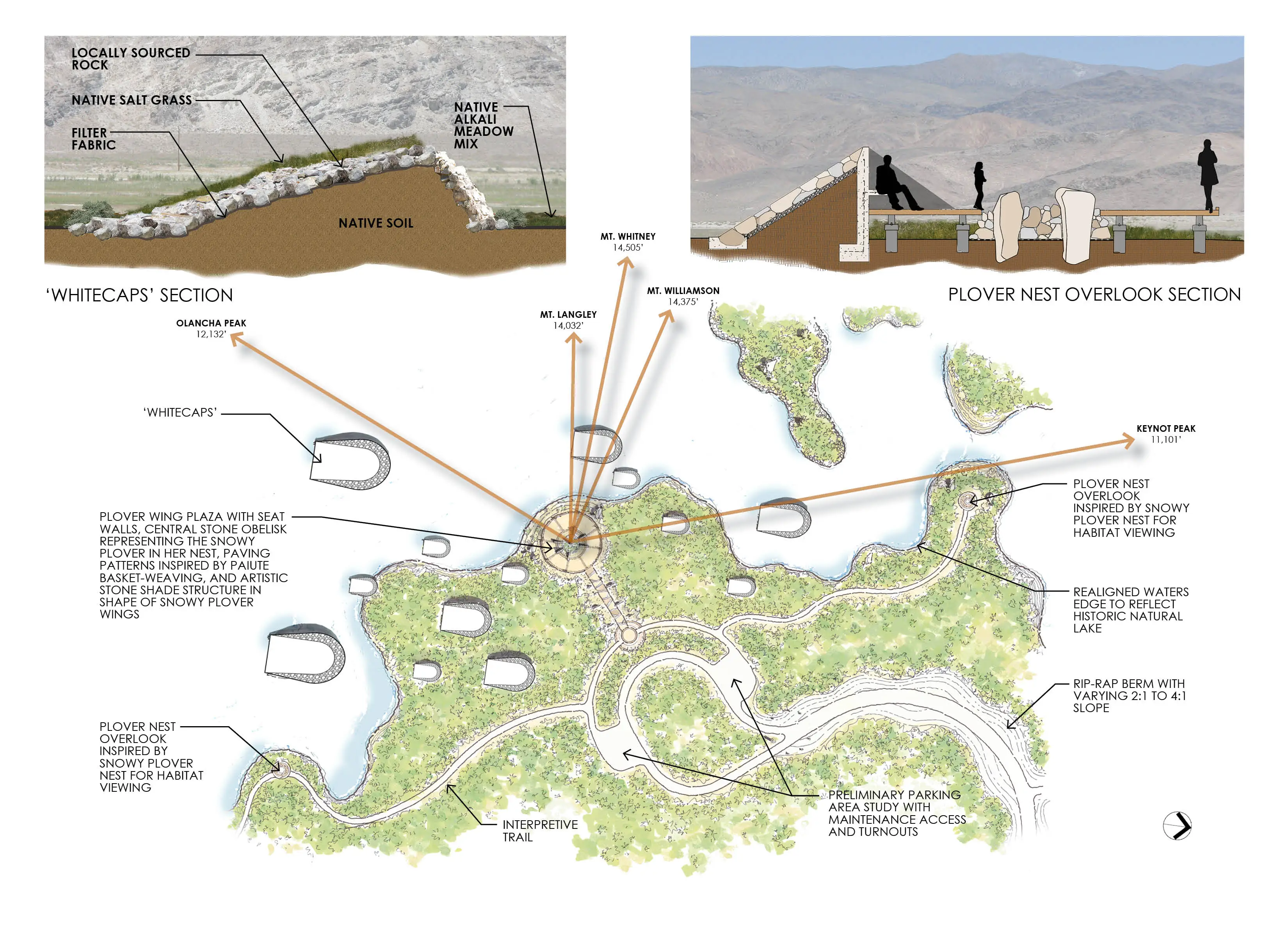 Imagine the lake before the river was diverted; a large body of water in a vast valley with 80 mile per hour winds blowing across its surface. Old photographs show the lake having the appearance of a small sea filled with whitecaps during its windy season. Our team, in collaboration with LADWP’s biologists, designed a monument to the lake’s past which solves the challenge of providing habitat for shorebirds, small mammals, and invertebrates. The ‘Whitecaps’ are large land forms in four size variations which provide niches and topographic variation for both plant and animal diversity. The shape and direction of the sculptures emulate the direction of white caps blowing over the once 110-square-mile lake. As the landscape architect/artist we embraced the unique beauty of this majestic place and understood the importance of designing a solution that is in harmony with the surrounding view shed while providing an important habitat benefit.