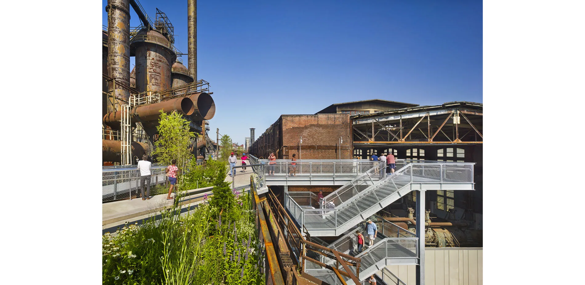 The Hoover-Mason Trestle structure was designed to tread-lightly over the existing structure. All new surfaces and planters are supported by a new steel structure that attaches at the location of the existing rail tracks, and the new structural steel was designed in weathering steel to blend with the existing SteelStacks, and allow the walkways to visually float above the structure, as a clearly identifiable new structure, juxtaposing new and old. Respecting the linearity of the rail tracks, metal-grating walkways run parallel immediately above the tracks, encouraging people to look down and acknowledge the existing site.