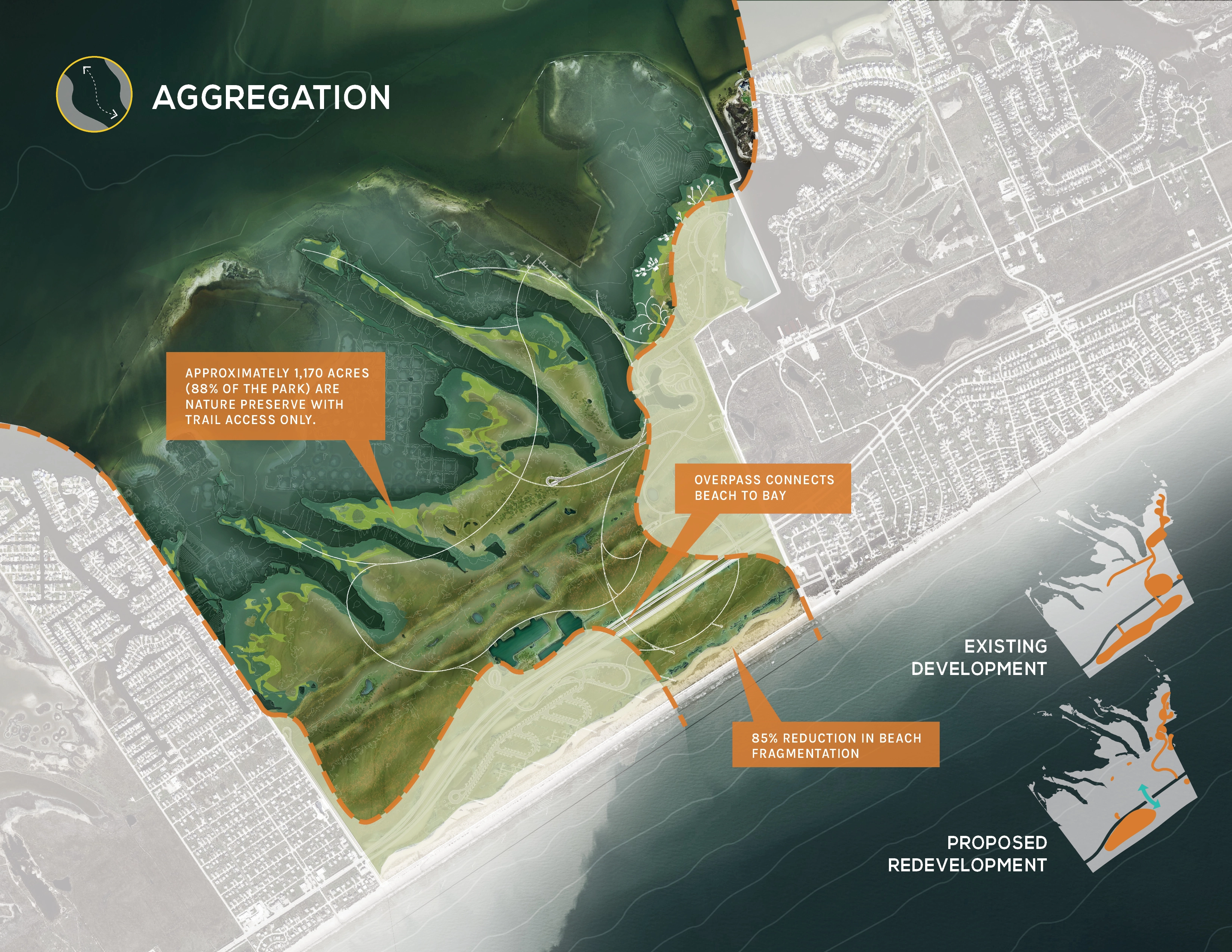 Site strategies reduce impermeable surfaces by 25% and significantly decrease habitat fragmentation. The transect trail engages guests with the full island cross section: bay to beach – the only location on Galveston Island where this is possible. Responding to a robust outreach process that sought out displaced residents, a broad array of overnight and recreation opportunities celebrate island environment. Endangered species and the rare Strand Prairie are protected, and development strategies encourage these delicate yet resilient systems to evolve and flourish.