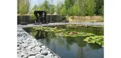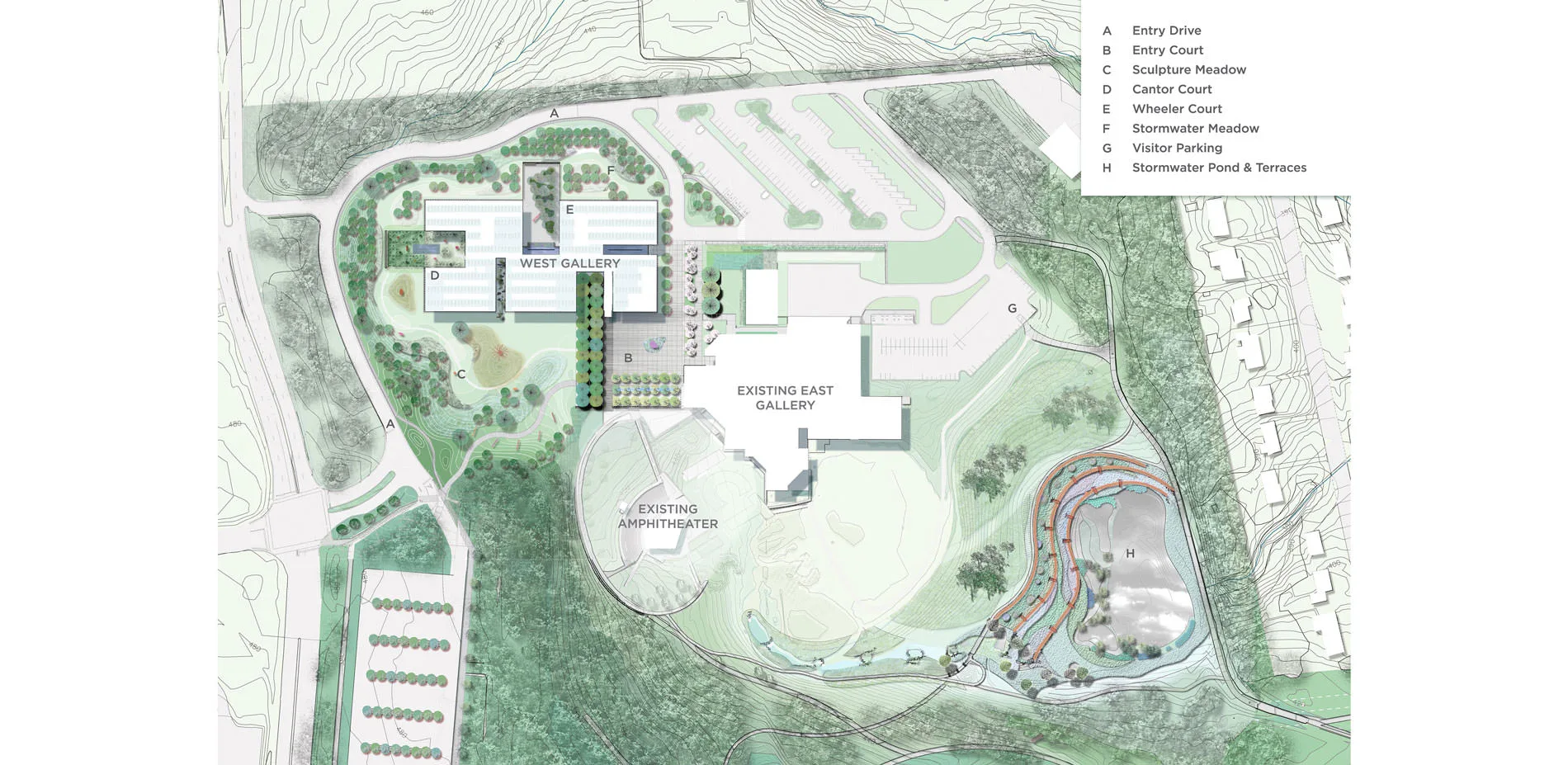 In addition to the sculpture gardens surrounding the museum, the landscape architect tied together disparate parts of the park with pedestrian connections and an intricate and innovative water management system. At the low portion of the site, a beautiful and functional seven-acre landscape with bioretention terraces, wetlands, lushly planted swales, and a one-acre pond were created to collectively capture, hold, and cleanse all of the stormwater from the developed portion of the property. A design gradient between art and nature was established on the site, with a formal design vocabulary in the landscape immediately surrounding the new galleries transitioning into a more naturalistic aesthetic as one approaches the pond. Within the wetlands, utilitarian elements such as inflow and outflow structures were conceived as works of sculpture that both contrast and fit beautifully within the landscape. Educating people about natural systems and the need to responsibly deal with stormwater became an important part of the project; doing so in a beautiful manner supports both the educational and artistic missions of the museum.