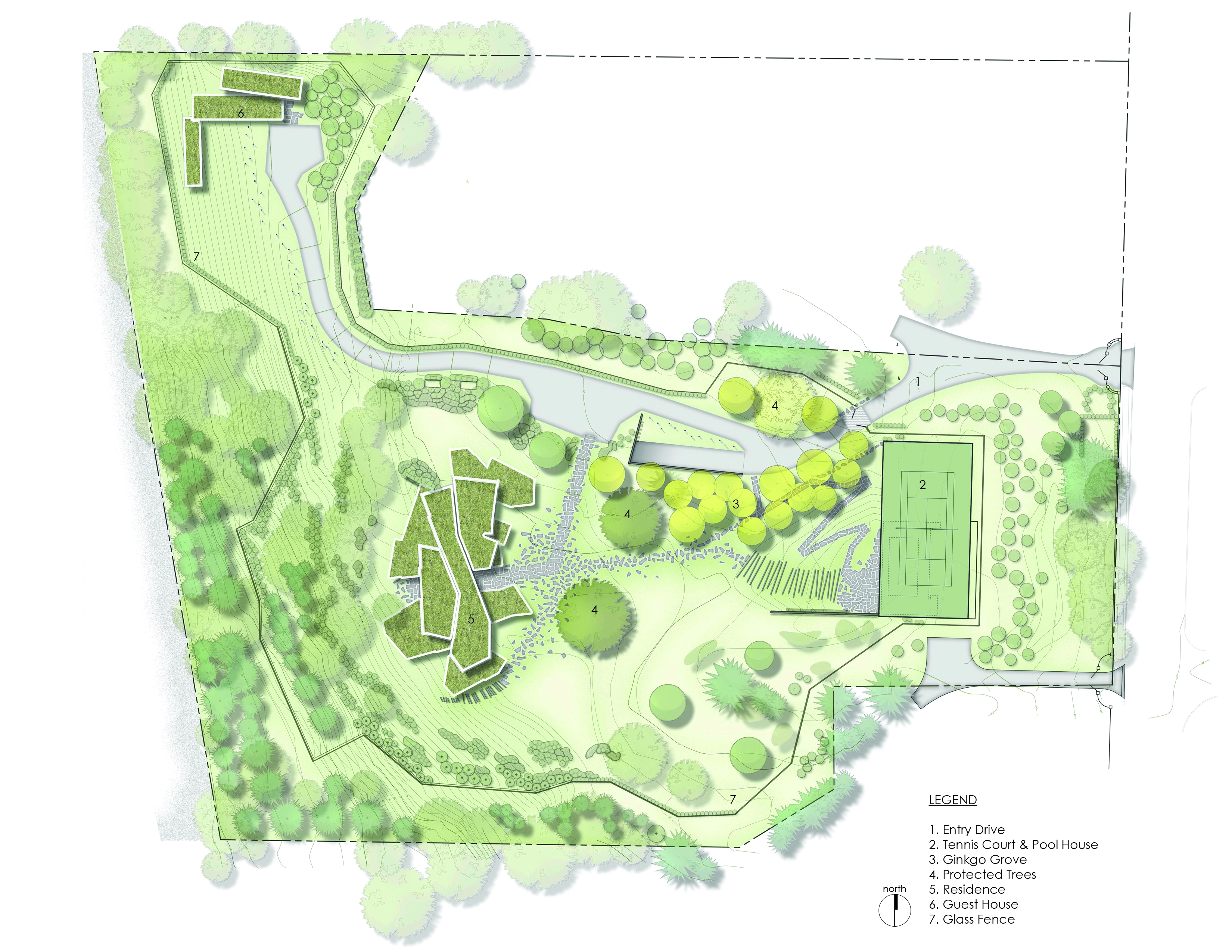 Weeping varietals of Blue Atlas and Alaskan Cedars, Beech, and Katsura punctuate the hillsides around the home. Distinguishable by their contorted, oddly-shaped habit, these specimens were selected for their abnormal expression of random recessive phenotypic variations. A grove of Ginkgos stand tall as an entry accent. Ginkgos were also selected for an extraordinary quality -- much like the cliffs that rise in the distance, they’re the only living fossil from 200 million years ago still in existence.
