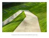 The site’s terrain is also magnified at the property’s edge where a high solid glass fence in a frosted finish undulates continuously with the peaks and valleys. When viewed from a distance, the opaque white line reads as an extruded register of the extreme topography ever-present in this region.