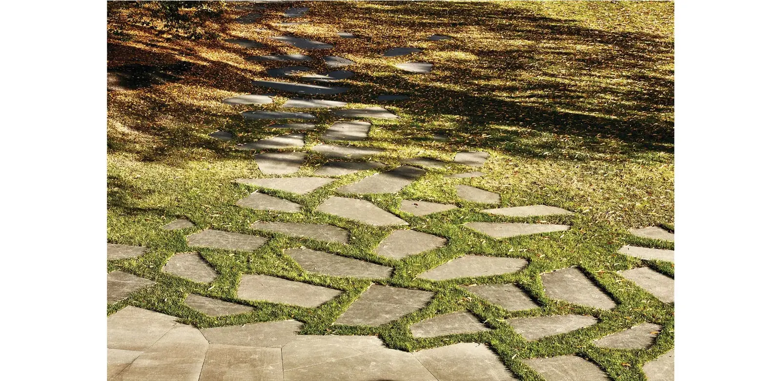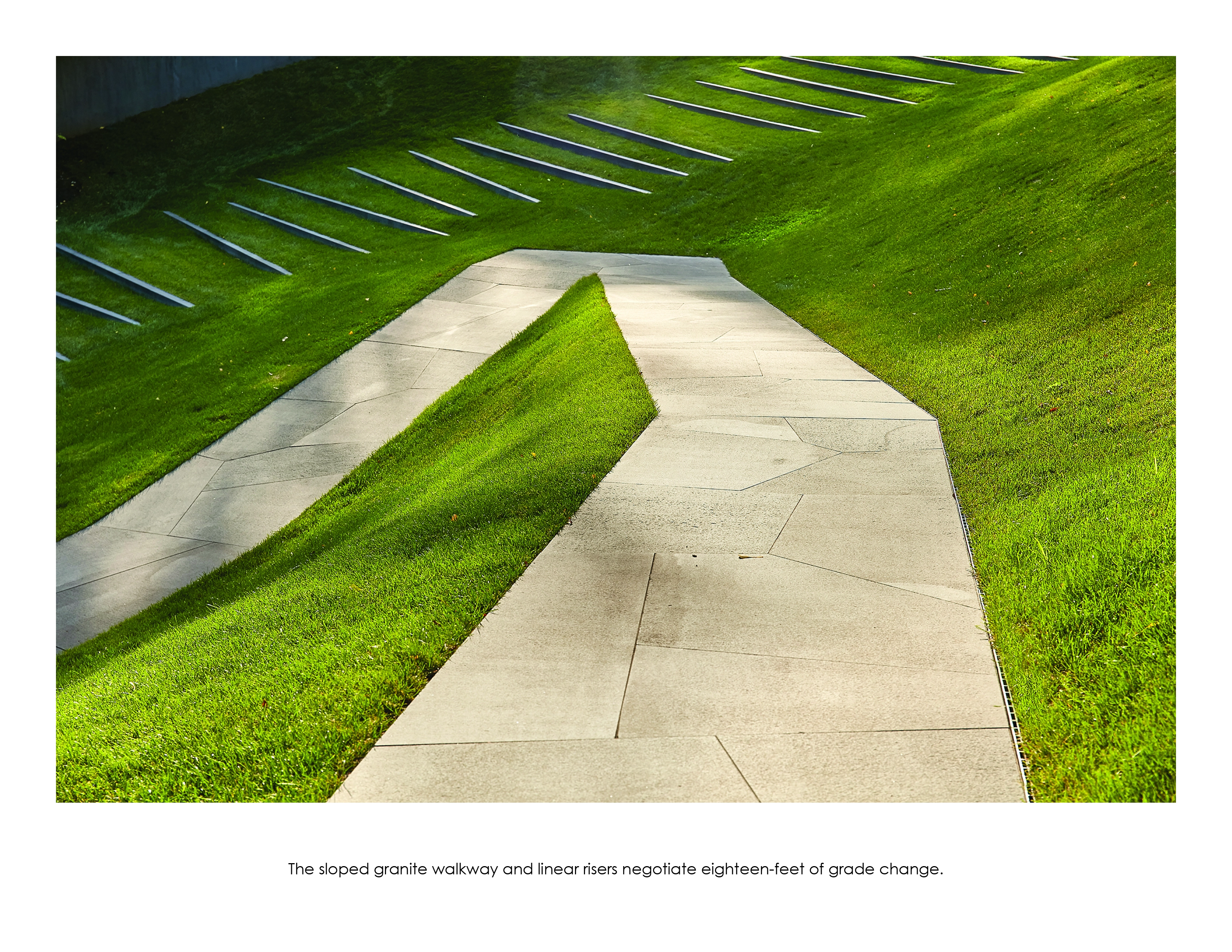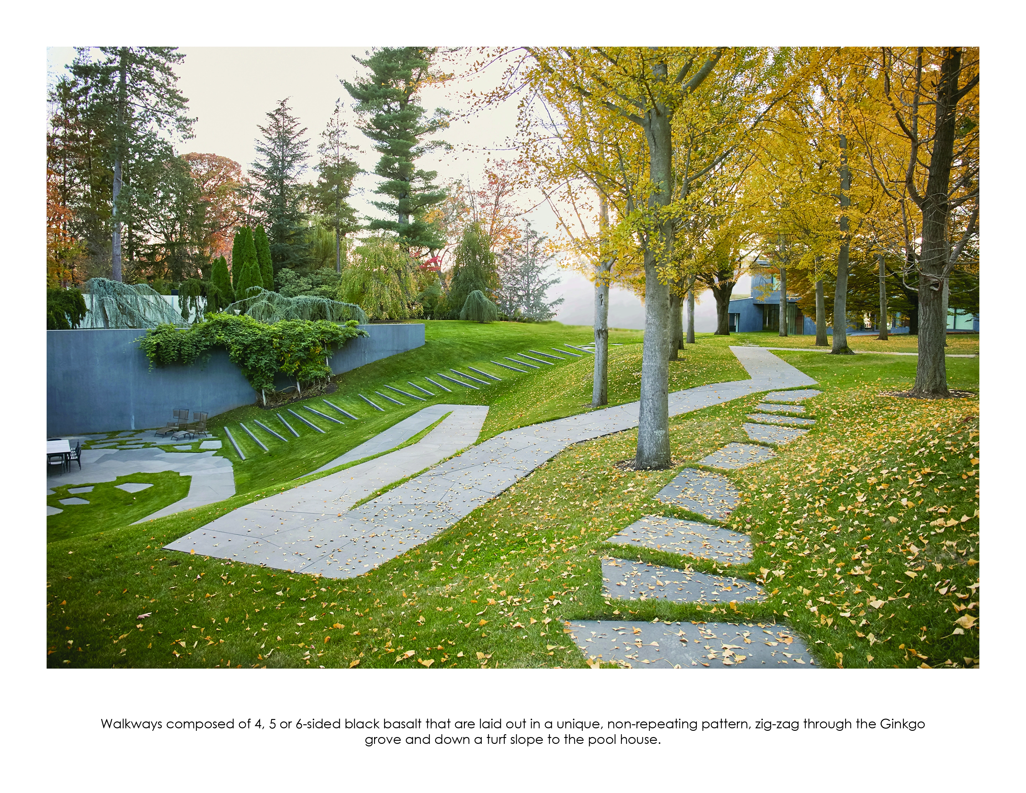 It’s in a grove of gingkoes. Consider how the stone in the path is cut to abstract the falling gingko leaves, giving an Asian feel.
