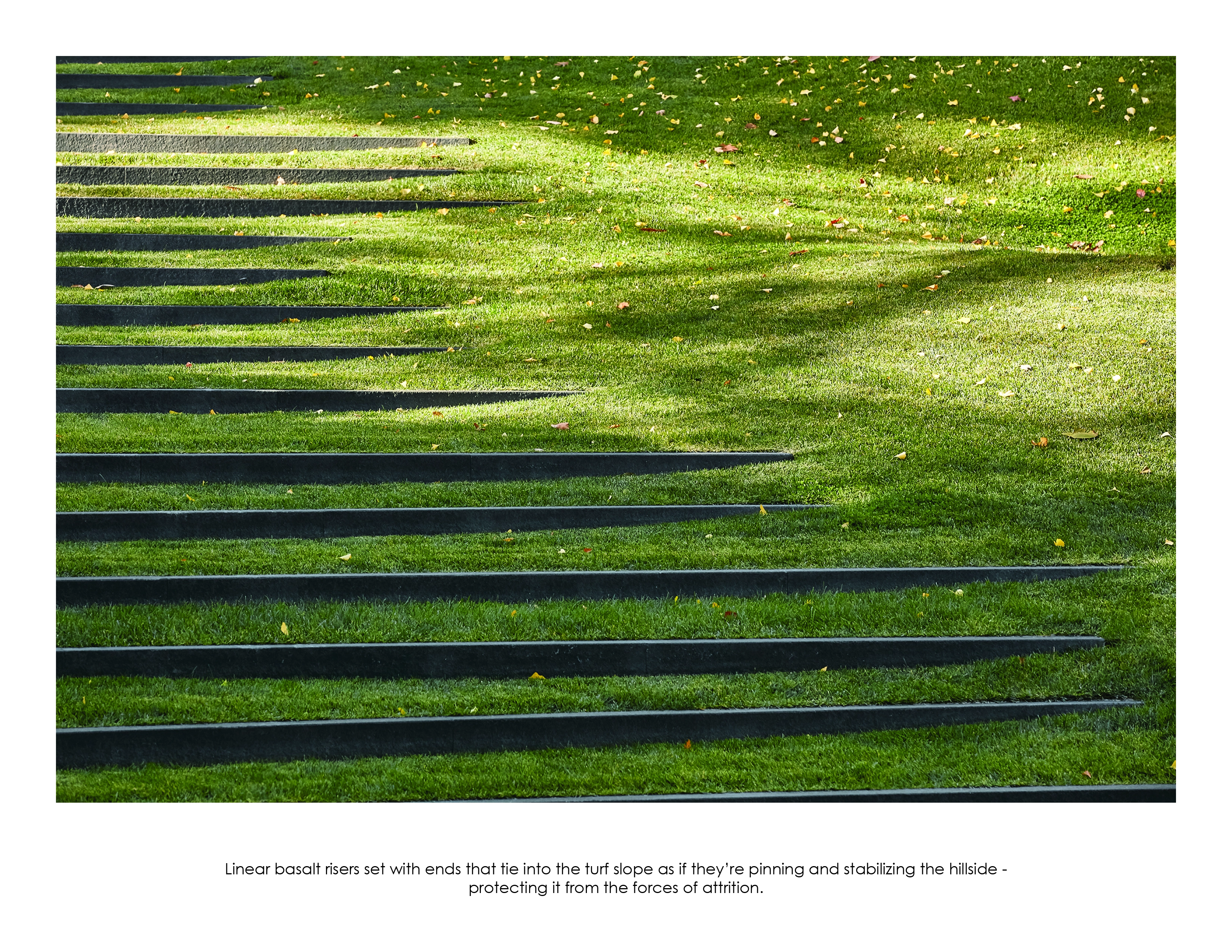 Hardscape elements take the form of irregular polygons and angled lines arranged in a seemingly chaotic configuration to abstractly evoke the concepts of entropy and evolution. Walkways are composed of 4, 5 or 6-sided black basalt pavers laid out in a unique, non-repeating pattern that breaks apart from the whole into erratic fragments beneath the existing trees. No two stones are alike. As the grade drops off toward the pool house, the stone transitions to linear basalt risers set at random angles with ends that tie into the slope as if their purpose is to pin and stabilize the hillside, protecting it from the forces of attrition.