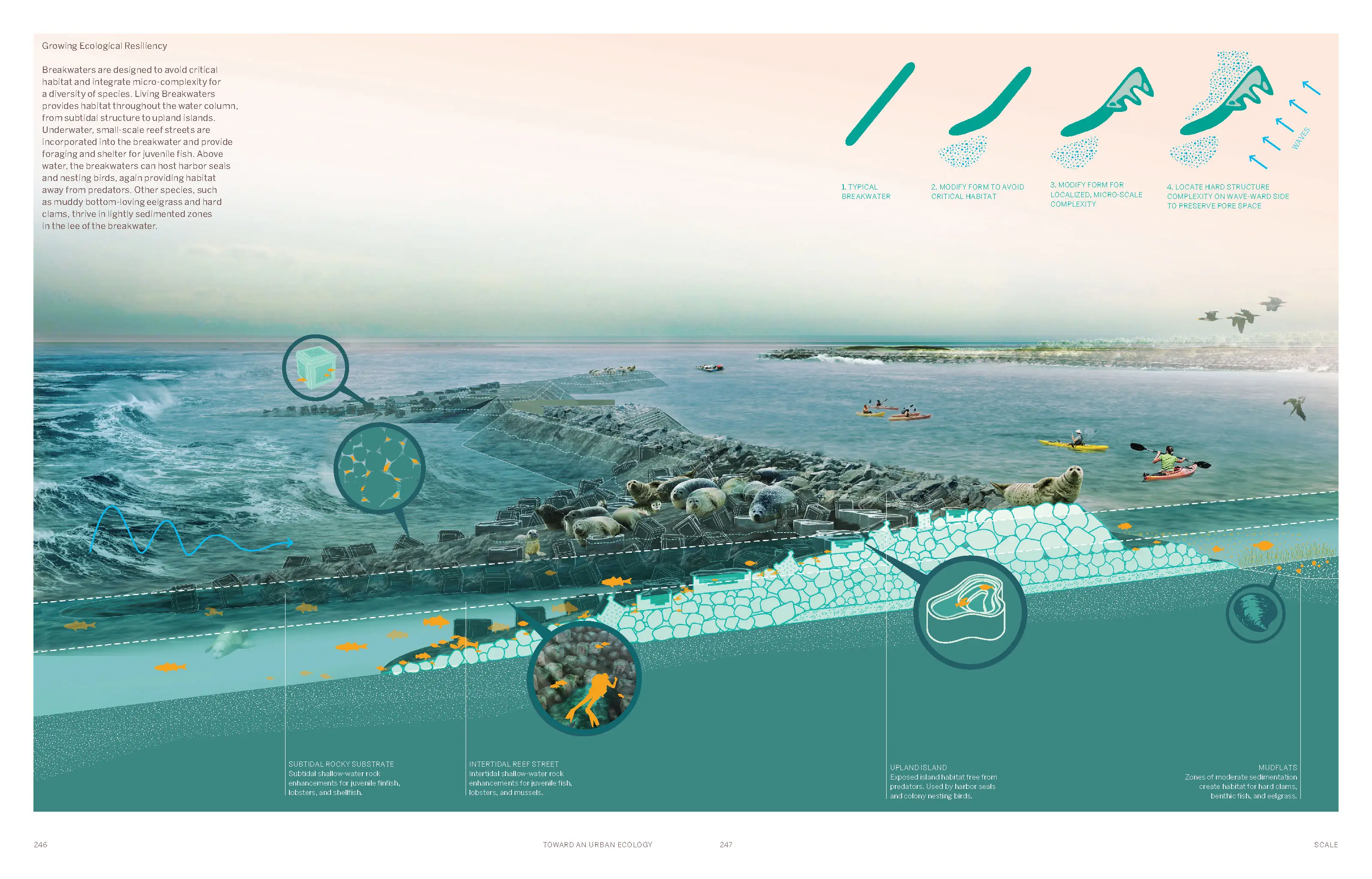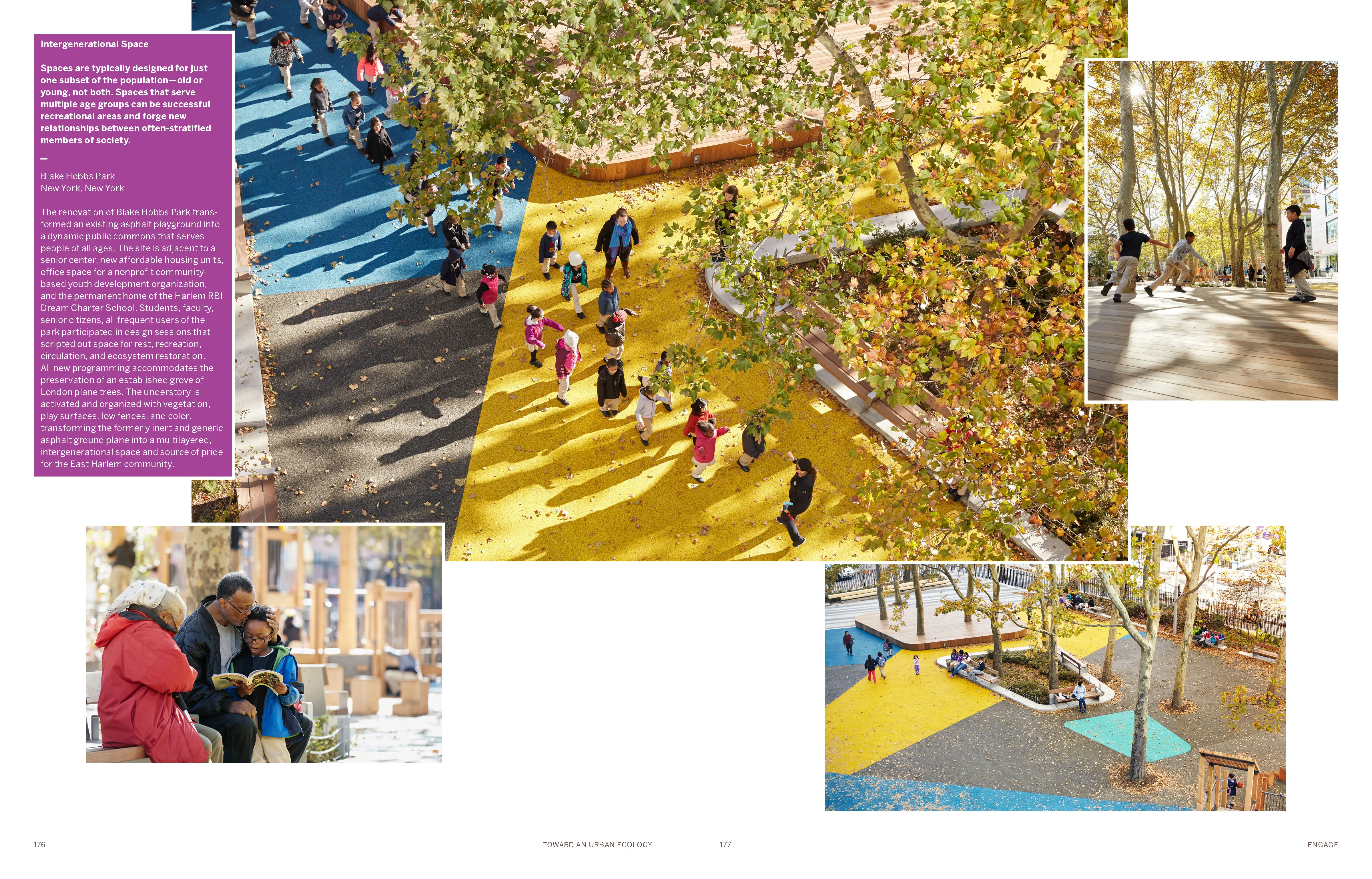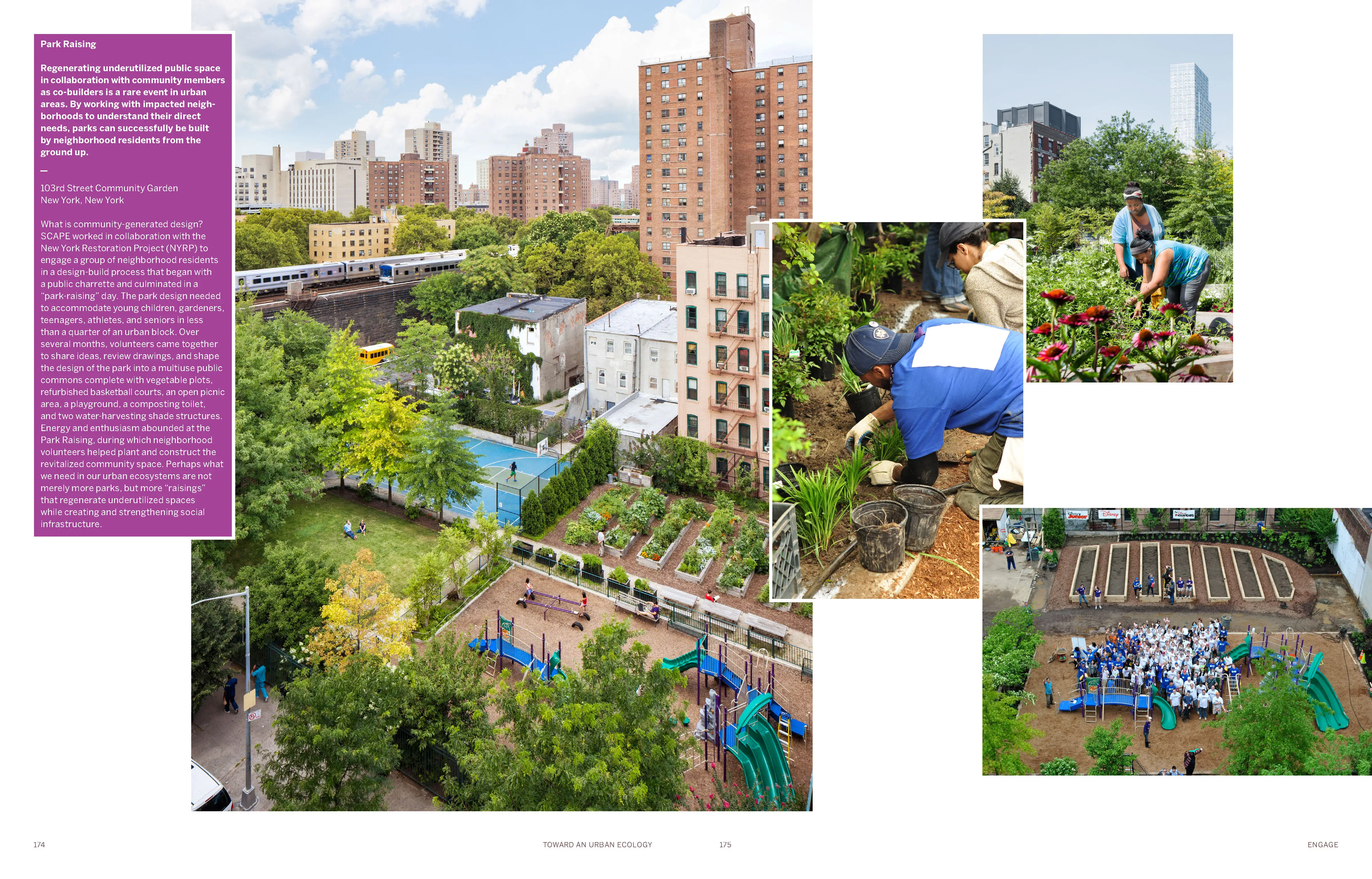 The Chapter titled Revive explores a design ethic that overlays natural and cultural systems toward the common purpose of generating eco-awareness. It features public spaces that hold water, and downtowns that can reclaim and reveal their relationships to rivers and bodies of waters that sparked their formation. Cohabit features projects that extend design thinking beyond our own species and that enliven the public realm to make space for animals and more diverse biology. Engage illustrates how design processes can hybridize community organizing techniques to nest project making within social life. Scale demonstrates the integration and scalability of the ideas and shows the potential for landscape practice to radically span scales from micro-pilots and ecological experiments to macro scales of planning and analysis.