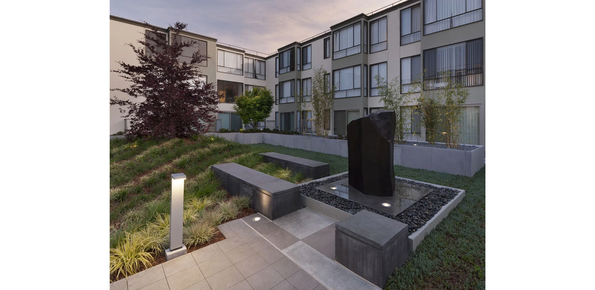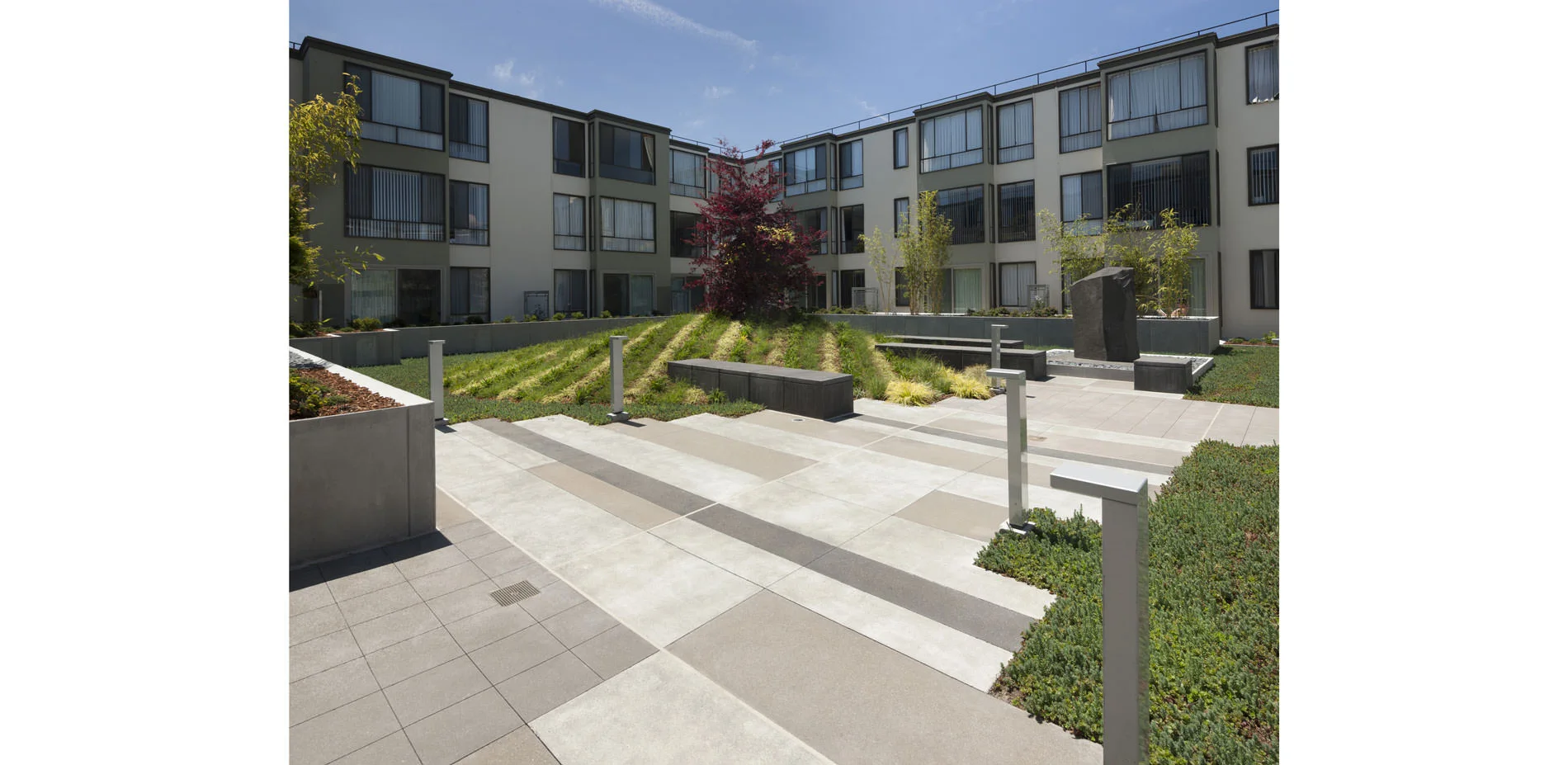 The NorthPoint Apartments, built in 1969 in San Francisco’s North Beach neighborhood, featured five courtyards designed by the office of Lawrence Halprin, located over podium parking. Half a century later, as the courtyard landscapes had to be replaced due to waterproofing failure, the design team successfully reinvented the project while meeting two aggressive challenges: honoring Halprin's legacy in a contemporary fashion; and reapportioning common and private spaces to meet changed expectations, within the tight constraints imposed by the original flat-slab construction. The strategy is one of carefully proportioned spaces, animated by finely detailed abstractions of the natural elements of water and stone: an homage to Halprin in the materials he used with such insight. All five courtyards — four fully interior and one at the adjacent property line — share forms and colors that pick up on the language of the surrounding buildings, but are differentiated from one another in their geometry, palette of plant materials, and focal elements.