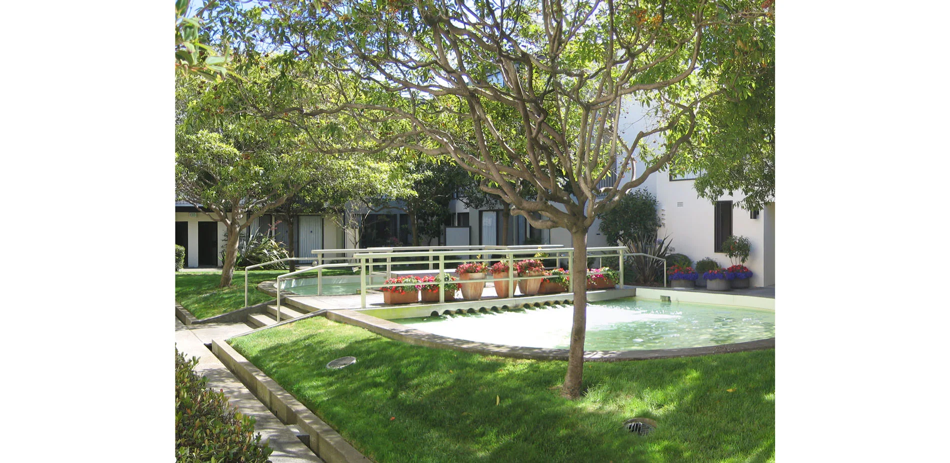 The original courtyard landscapes, designed by the office of Lawrence Halprin, had to be removed because of the failure of the decades-old waterproofing systems, which threatened the building structure as a whole. All five courtyards—four fully internal, the fifth at an adjacent property line—provide both common space and individual patios for first-floor apartments. Two of the principal courtyards have swimming pools; the other two have significant water features. At the client’s request, which corresponded with the designer's philosophy, the new landscapes do not attempt to replicate the original designs by Halprin, but instead are conceived as an homage to him in the elements he combined with such insight: water and stone. As a part of the research undertaken to understand Halprin's original intent, his project manager was invited to review the new scheme, of which he observed, "You have done a splendid job of maintaining the spirit of the original designs while updating them in both feeling and materials." Each of the five courtyards has a distinct character, but they are united by a vocabulary of form, color, and refined detail that picks up on and enriches the language of the buildings designed by Wurster, Bernardi & Emmons. Constrained by the slab from going deeper, both planting and water elements are raised up, providing space for infrastructure and increased soil volume to intercept rainfall and slow runoff. Yet the goal is ultimately spatial: separating more equitably defined private patios from well-proportioned common spaces anchored by focal elements —a sculptural water feature, a massive, sculptural steel planter, a tree.
