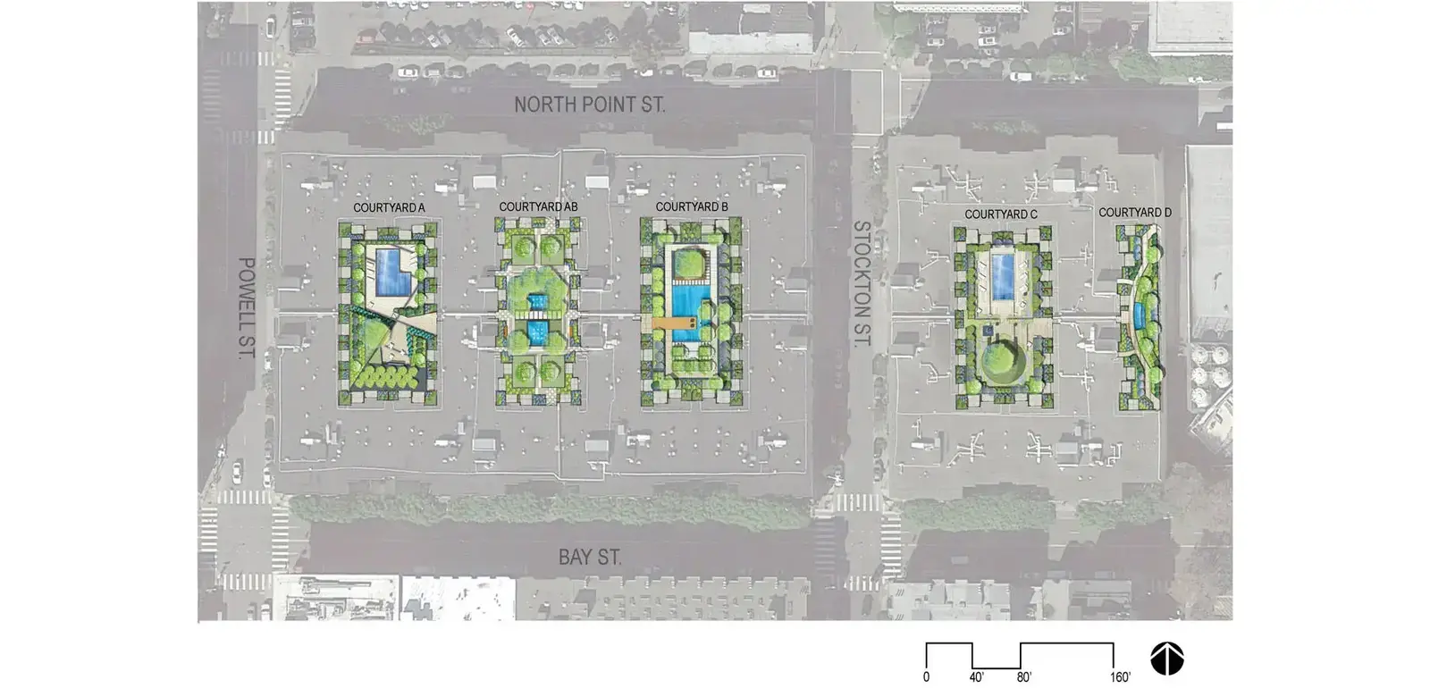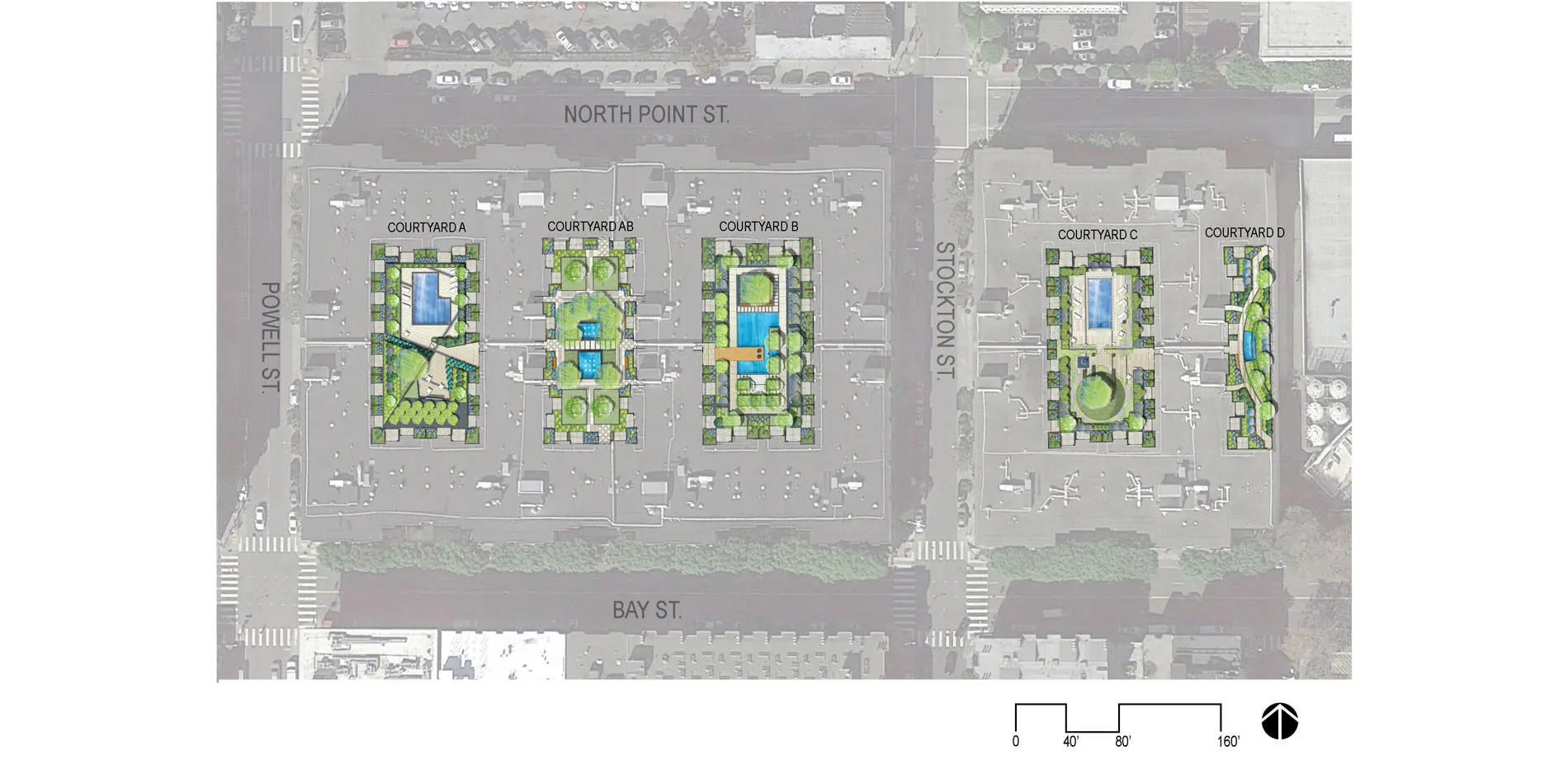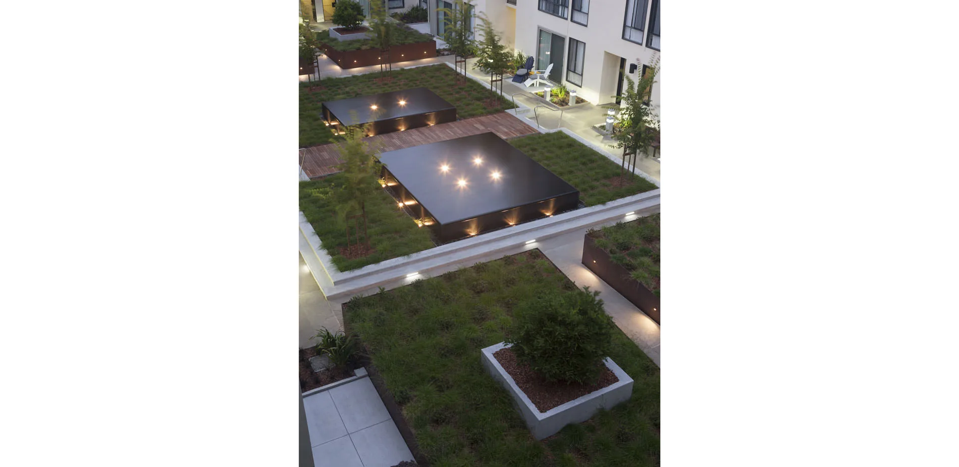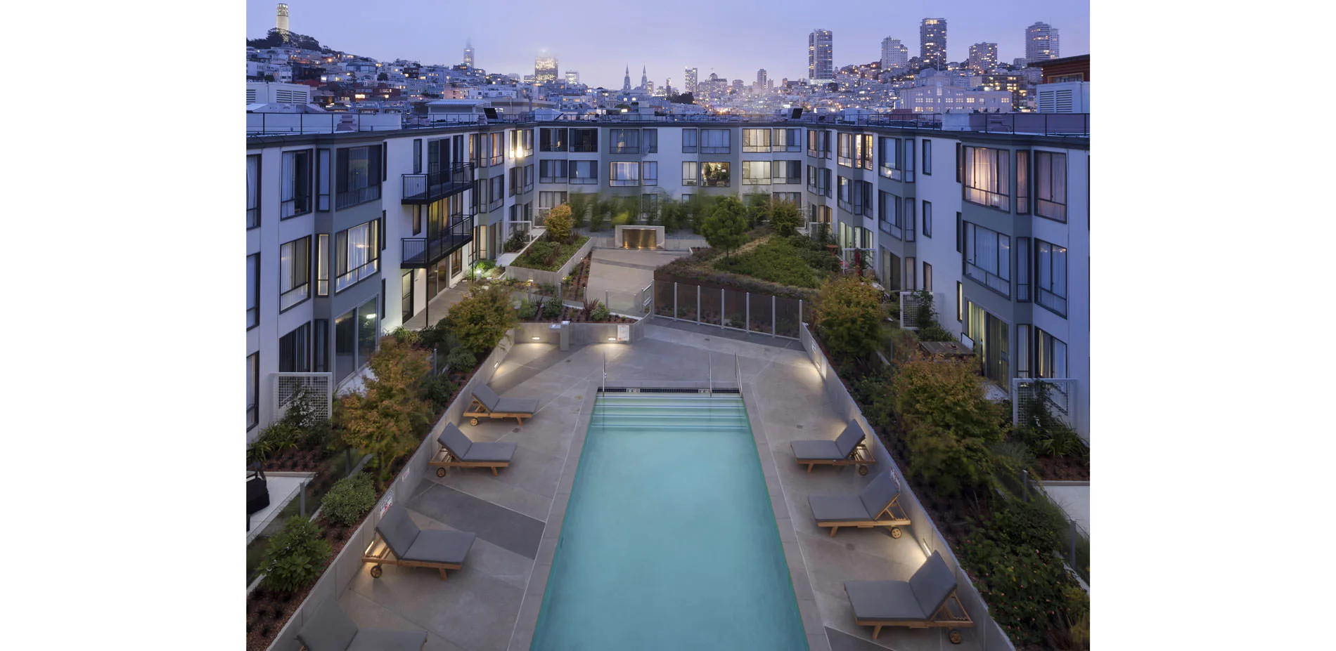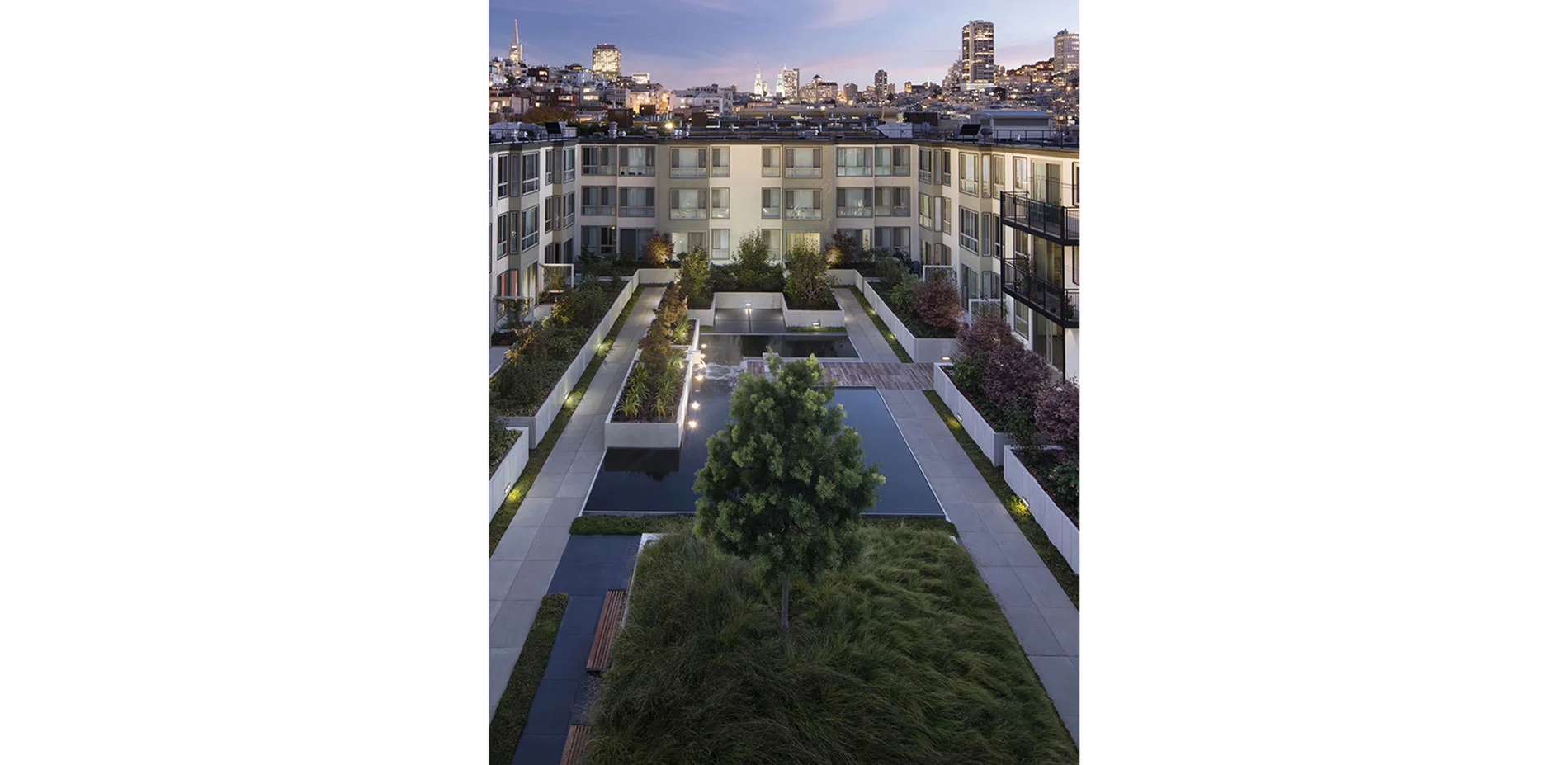 This project comprises the redesign of five courtyards over podium parking, as part of a major renovation of an apartment complex originally constructed in 1969 in San Francisco’s North Beach neighborhood. The original courtyard landscapes, designed by the office of Lawrence Halprin, had to be removed because of the failure of the decades-old waterproofing systems, which threatened the building structure as a whole. All five courtyards—four fully internal, the fifth at an adjacent property line—provide both common space and individual patios for first-floor apartments. Two of the principal courtyards have swimming pools; the other two have significant water features. The design of the new landscapes was severely constrained by the existing flat-slab construction. Nevertheless, by utilizing existing depressions in the slab, building up new areas, and applying both extensive and intensive green roof planting strategies, the scheme increased the breadth and depth of soil areas to create a rich garden setting in keeping with Halprin's original design intent. The choreography of raised elements integrated that goal with the larger goal of defining common and private spaces, while at the same time accommodating necessary state-of-the-art waterproofing and infrastructure systems.