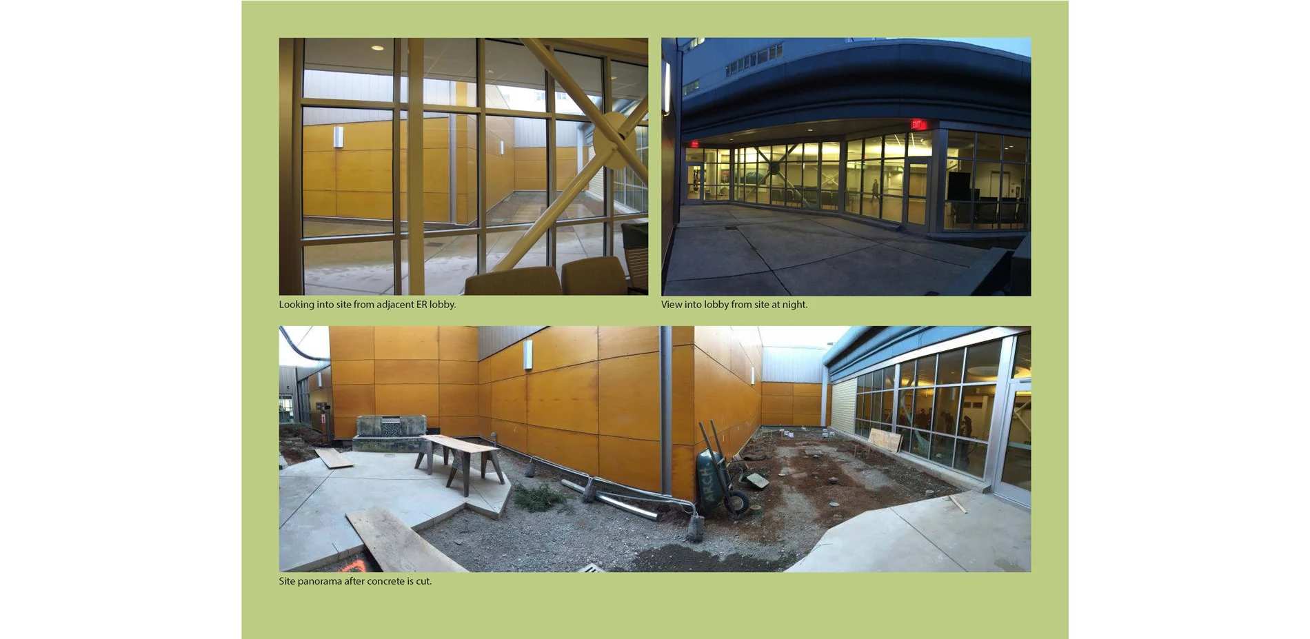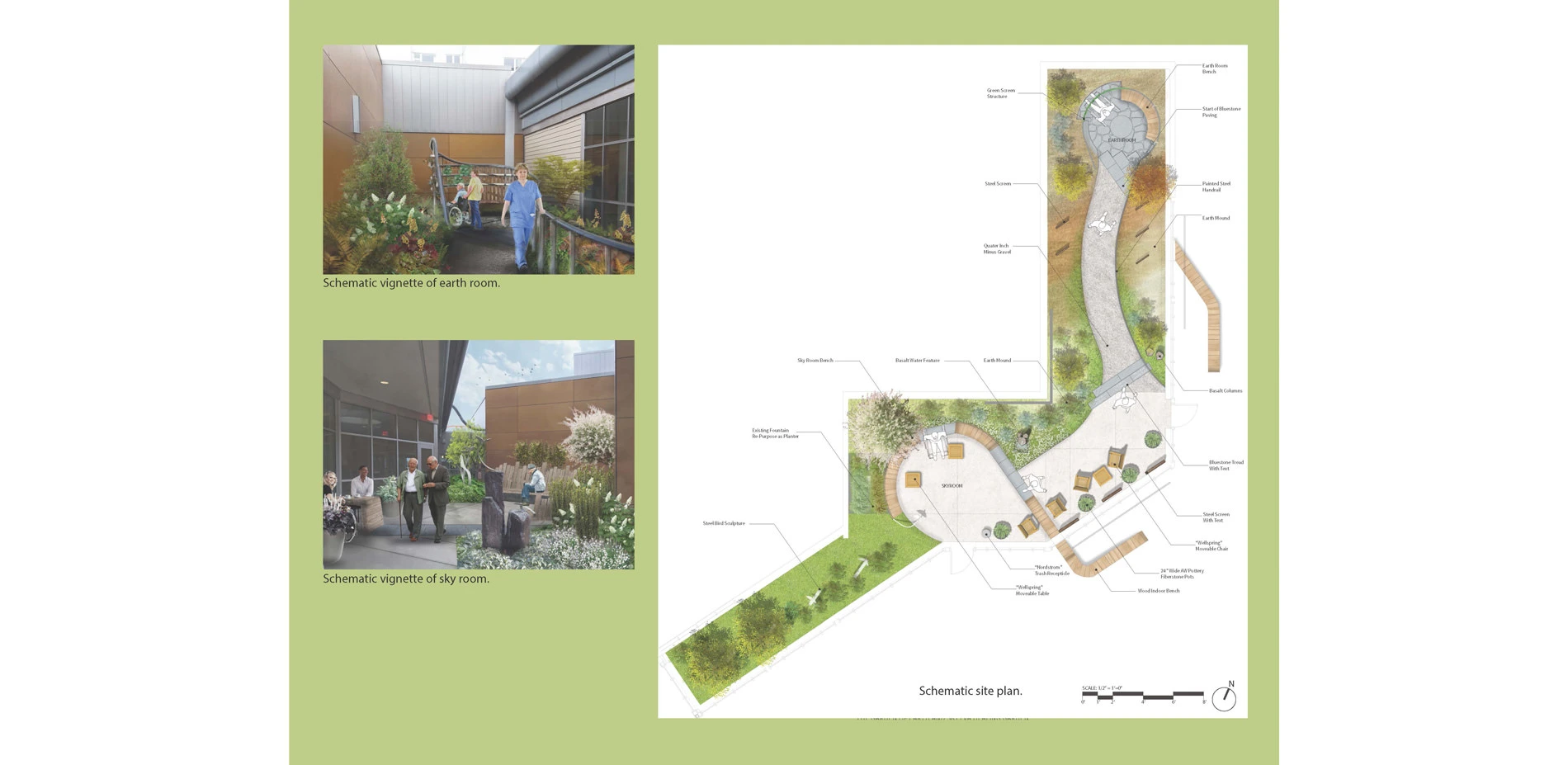 Programmatic goals include providing a calming refuge and place of respite, place to increase social interaction, spaces for meditation and a green counterpoint to the institutional quality of the hospital environment. The site is an enclosed courtyard space flanked by floor-to ceiling windows along its border, and a secondary goal was to incorporate privacy screening for garden users while simultaneously offering a pleasant, meaningful view from those indoors.
