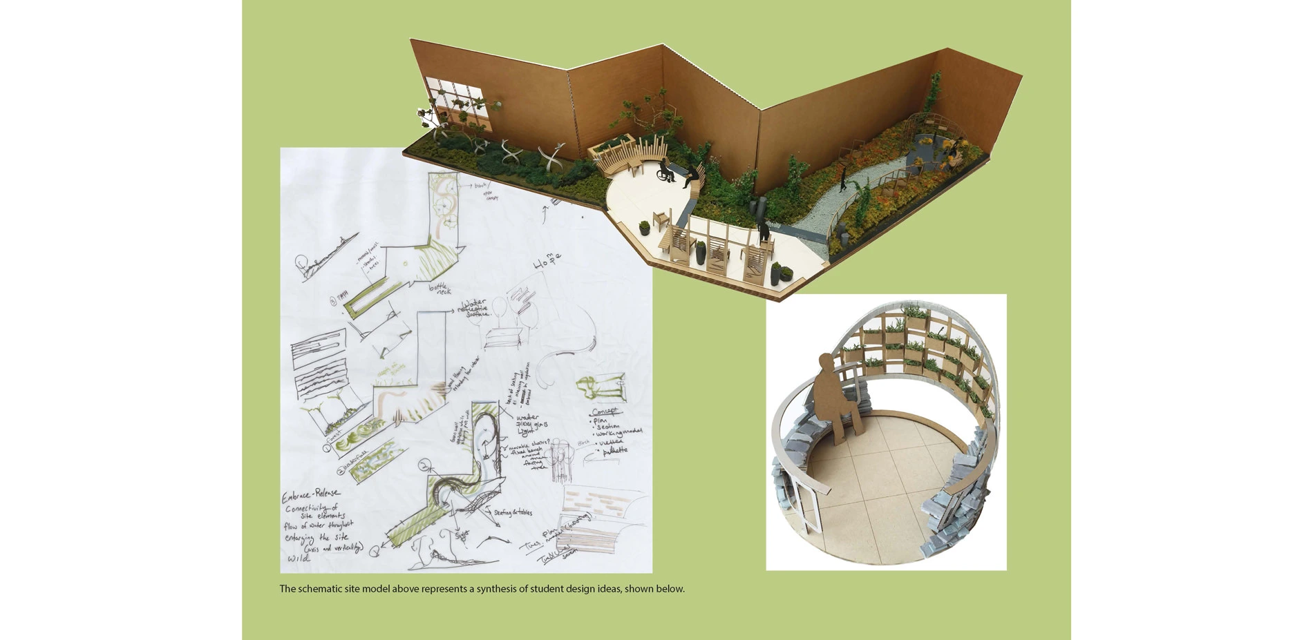 We gained additional research-based information by collaborating with graduate students in an occupational therapy program from another University. The students were essential in providing guidelines for design on a human scale, informing us of dimensions necessary for our design to be comfortable and universally accessible. A team of students working on the project visited the facilities for occupational and physical therapy within the hospital to better understand how the physical rehabilitation process occurs and how indoor clinic elements could broadly be incorporated into the garden. Wheelchairs were brought into the space to experience first-hand, what it was like to move about the courtyard. It was clear that this garden would fill a unique gap within the hospital for healing of the mind and body. We were also honored to have access to personal letters written by veterans throughout history, the oldest being from the Civil War. These letters provided precious anecdotes of the healing effects of nature on the mind and body. These letters, combined with the personal accounts from veterans we met throughout the participatory design process, inspired our purpose for designing. The final result would not have been successful without close and frequent collaboration with the veterans, our occupational therapy student colleagues, and therapists at the Puget Sound Veteran’s Affairs Hospital who so graciously and helpfully informed our project. Design Intent