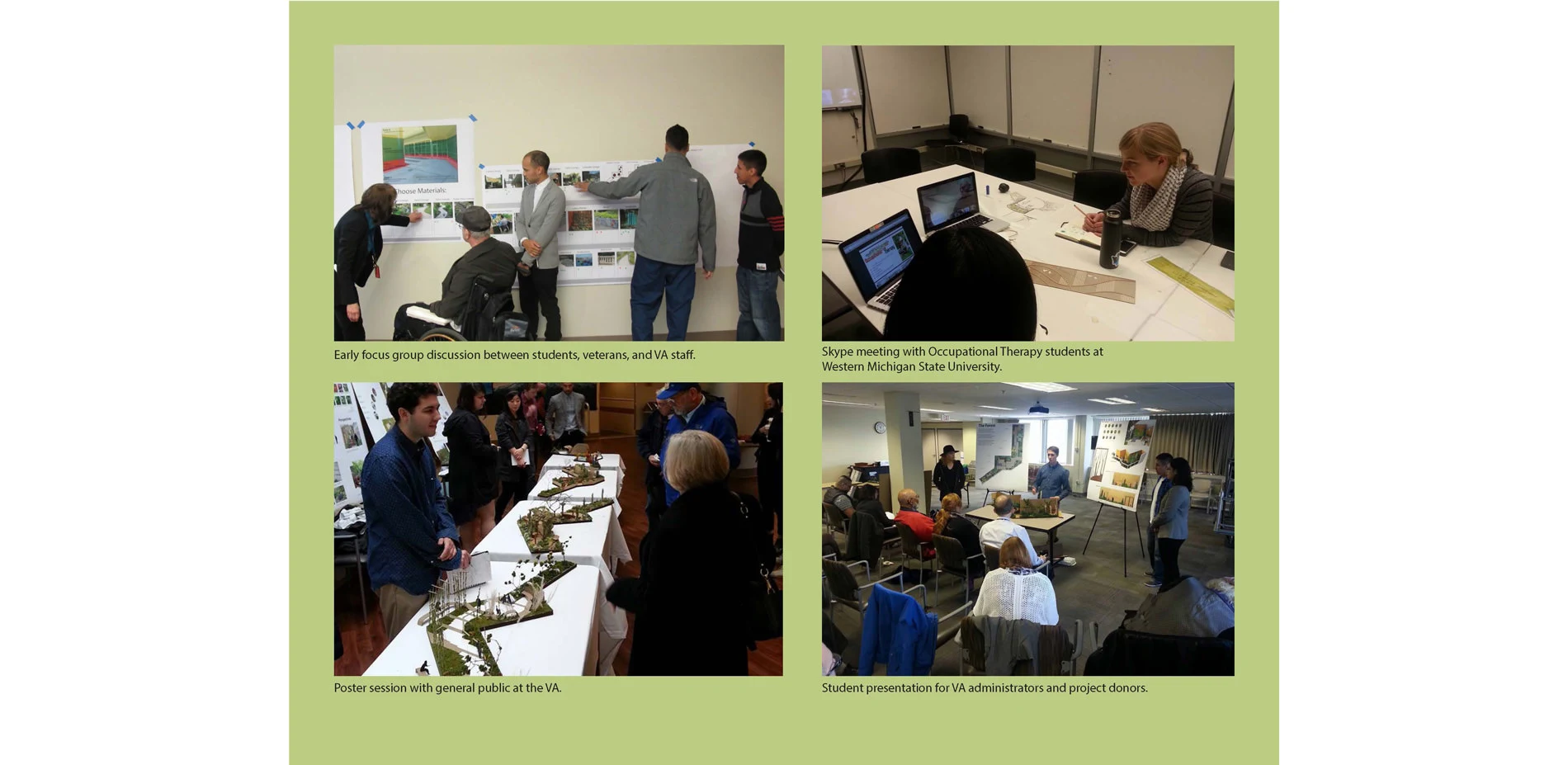 The garden is being maintained by the VA facilities department using the maintenance manual created by the students and supplied to the VA by the studio. In the future we hope to work with the VA to conduct evidence-based research studies on user impressions of the garden.