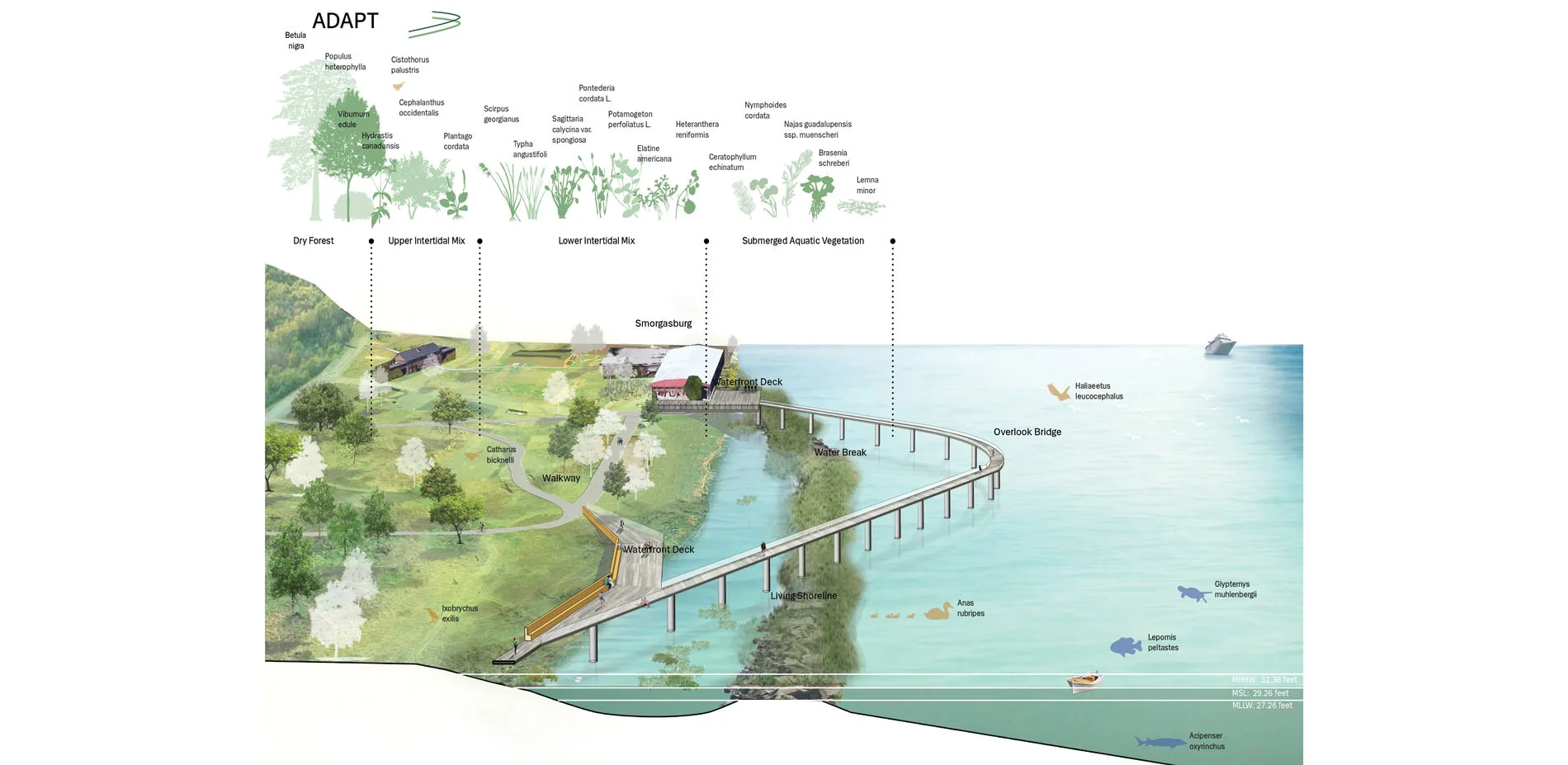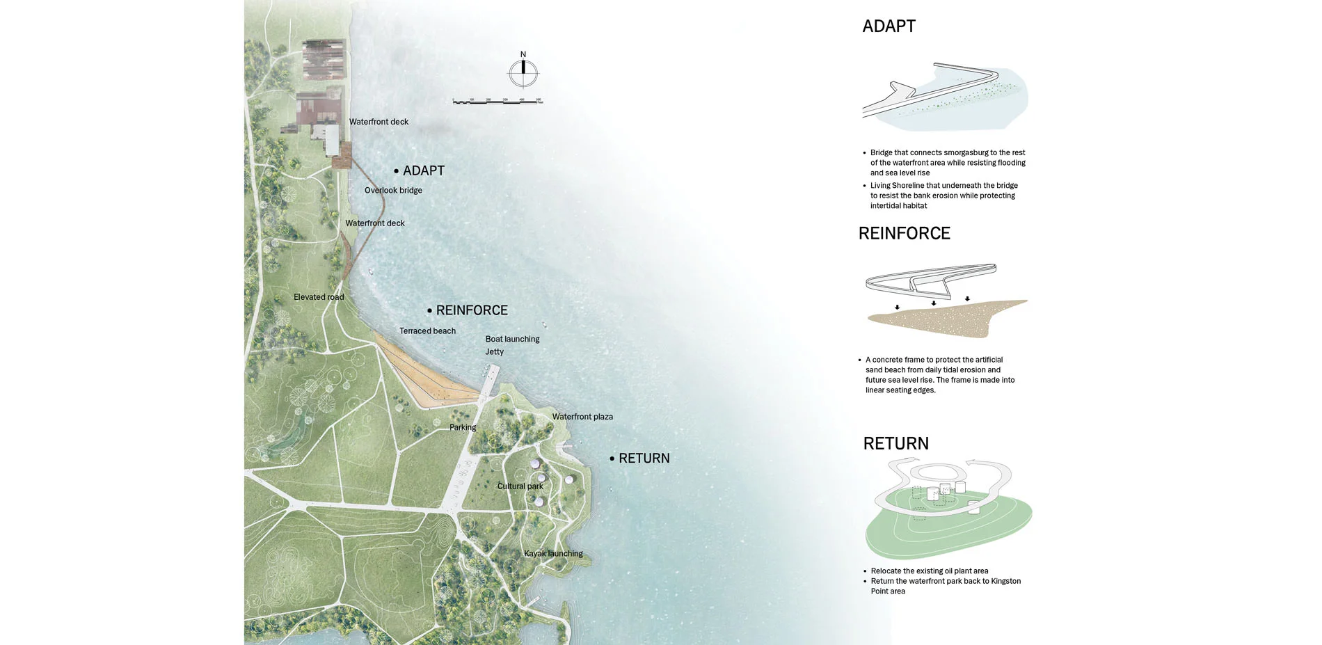 The Weaving the Waterfront proposal revitalizes a 38.3-acre site along the Kingston Point by introducing original ideas of ADAPT, REINFORCE and RETURE. Focusing on the issues of climate resilient strategies, public spaces, and wetland restoration, this proposal coordinate nature, human and climate change with dynamic process and minimized earthwork.