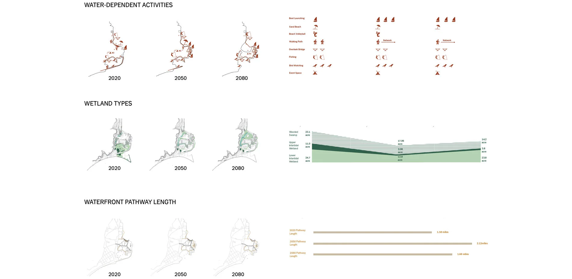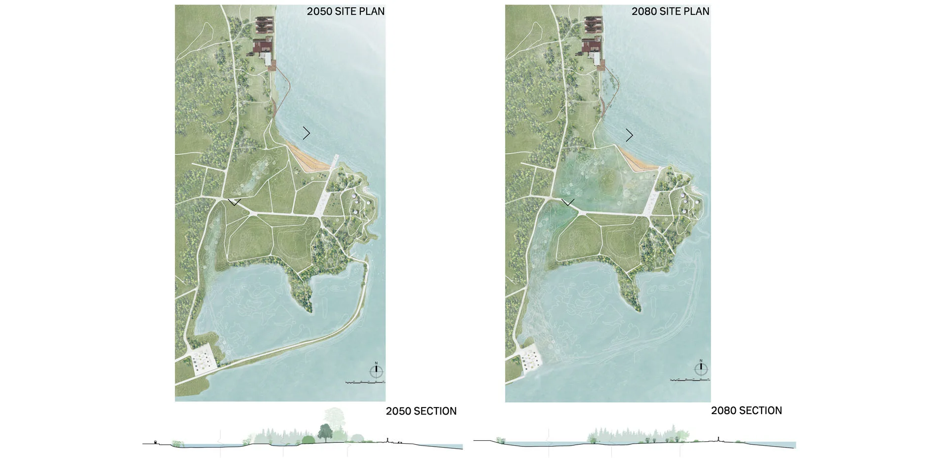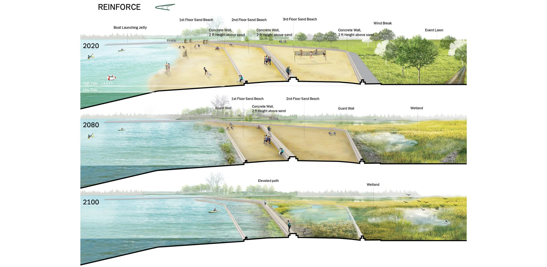 The program ADAPT happens in the north area of the site. A living shoreline is adopted to protect the waterfront from wave erosion and create more wetland habitats, especially for those threatened local species. To increase the connectivity and accessibility of the waterfront area between the beach and the historical attraction Smorgasburg, an overlook bridge reaching out into water will be built. REINFORCE locates in the middle of the site to keep and strengthen the existing beach that widely loved by locals and visitors. An idea of terraced beach is introduced to cope with rising sea level and tidal erosion with minimal change. With construction of three concrete walls and a tiny bit of elevation of the sand level, functions of the sand beach will be prolonged to 2080 until it’s finally inundated, while wetland will gradually take over the lawn behind the terraced beach and become dominant in 2100, turning the highest and widest wall into a elevated path to a functional pathway.