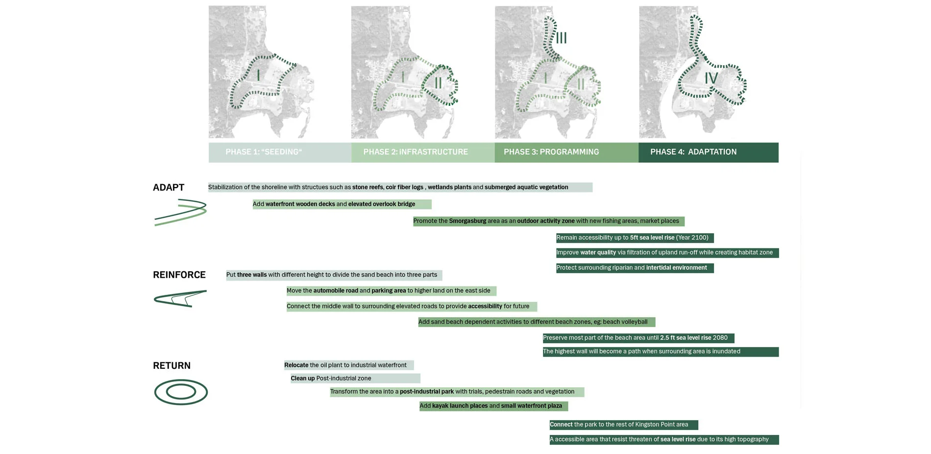 By introducing original ideas of ADAPT, REINFORCE and RETURE, the proposal integrate Kingston’s waterfront to a vibrant and active place both in short and long time span to adapt to the anticipated effects of global climate change and people’s need for safe and stable waterfront space.