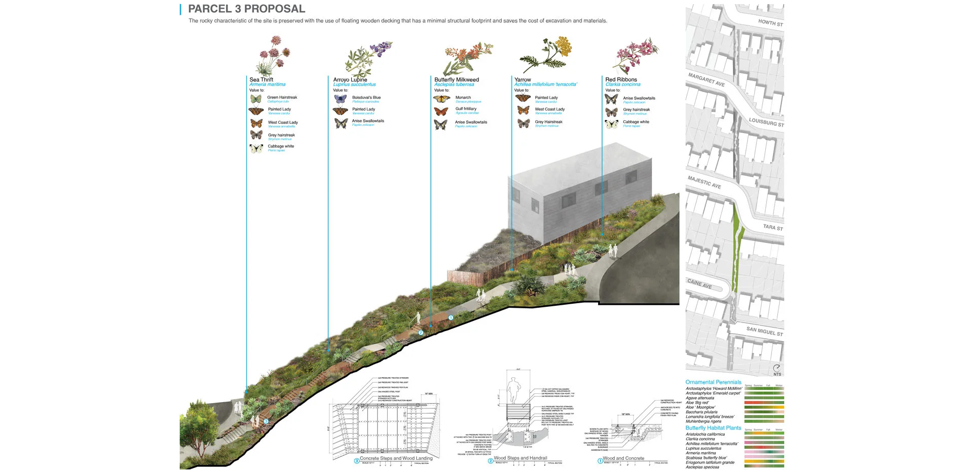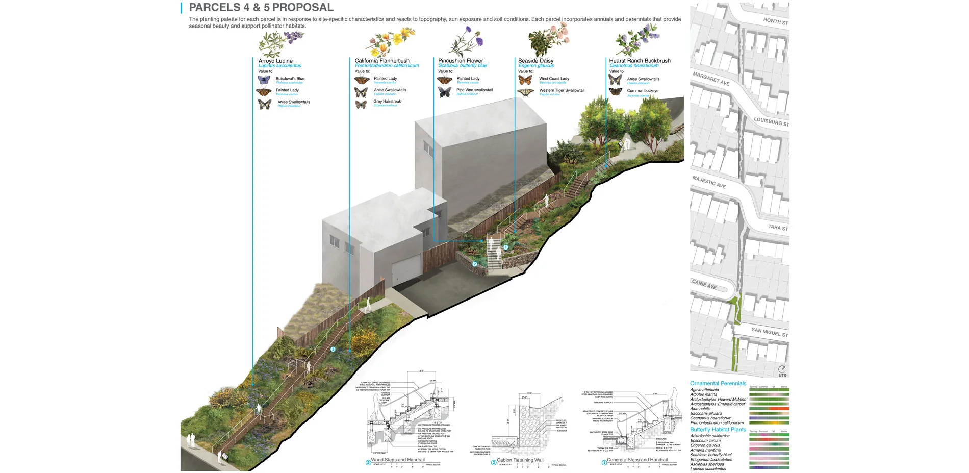 The design of the remaining parcels has been coordinated with the in-house landscape architects and structural engineers of the San Francisco Department of Public Works to ensure its compatibility with city codes and standards. Due to its size and current hazardous conditions, Parcel 4 was chosen to be developed next. Thanks to the finalized plans and conceptual imagery, Ridge Lane Neighbors have acquired a government grant to fund the construction of Parcels 3 and 4.