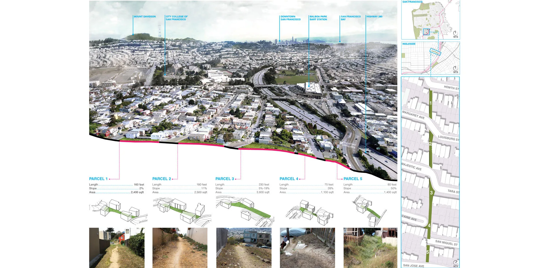 Located in the Ingleside neighborhood of San Francisco, Ridge Lane is one of 1,500 vacant public spaces owned by the City. The site is 15 feet wide and approximately a quarter mile in length. It is composed of five individual parcels separated by city streets.