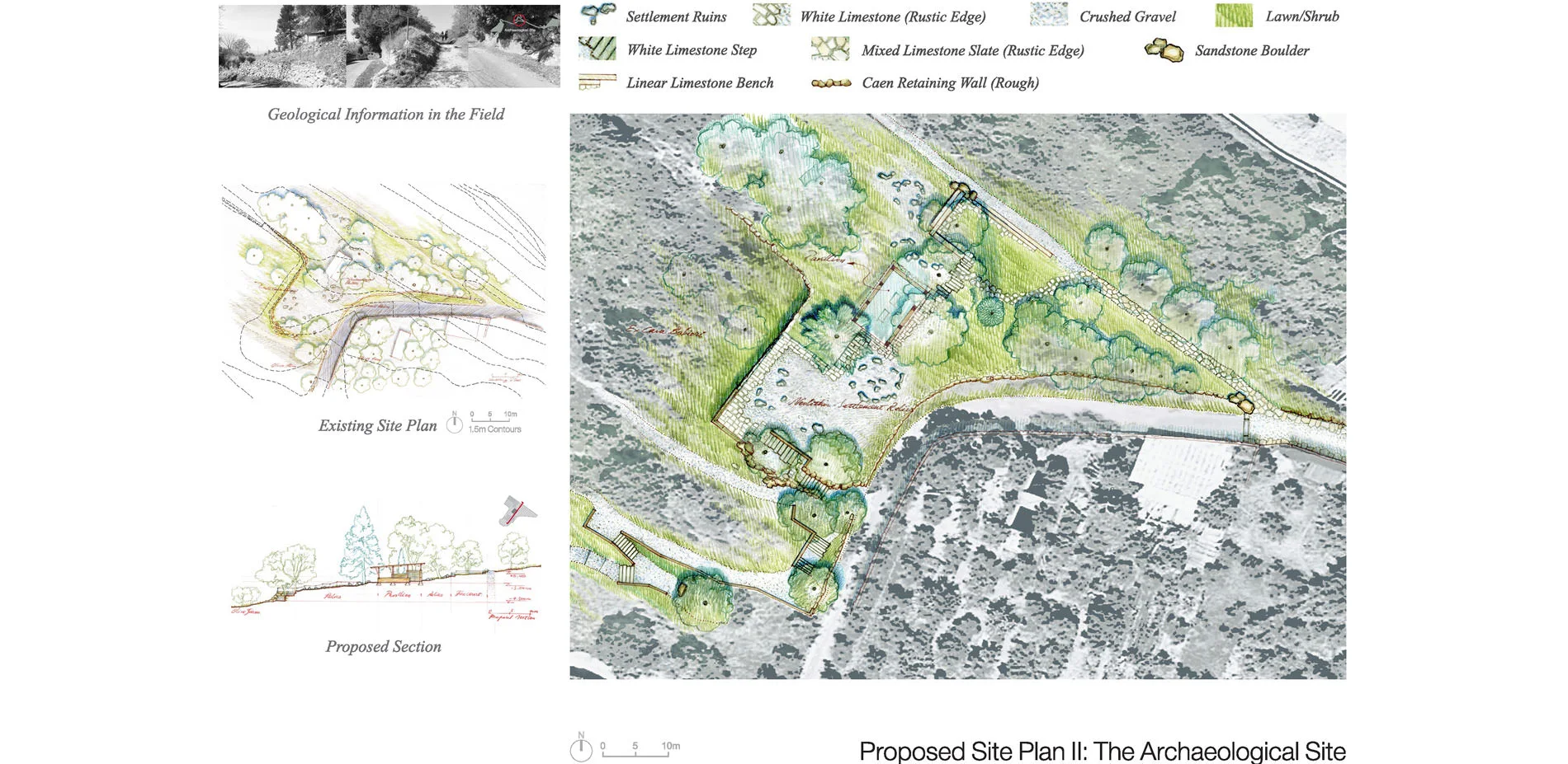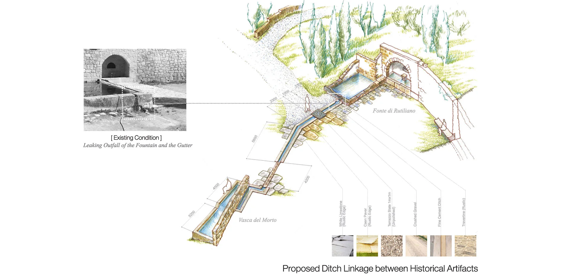 In this site, the historical artifacts, which include a medieval church (Pieve di Corsignano), a fountain (Fonte di Rutiliano) and a relic of Vasca del Morto, are isolated by an asphalt shared road. Despite a limit of vehicles on the road, the space in front of the fountain is used as a surfacing parking area for tourists. The concept is to integrate the three sites by repaving the field with rustic Caen stone paver and white limestone to give priority to pedestrians over vehicles. The Caen stone adopted in paving and seats is a response to the typical stone mass used on the church and the fountain in this site. Relying on the existing topography, a water ditch is designed as a linkage between the fountain and the overlooked relic, Vasca del Morto, in order to amplify the genius among the isolated artifacts. In addition, some standstone boulders are settled on the site to give an implication of the geology in the region. The Archaeological Site: Ex Cava Barbieri and Insediamento Neolitico (Old Quarries and Neolithic Settlements)