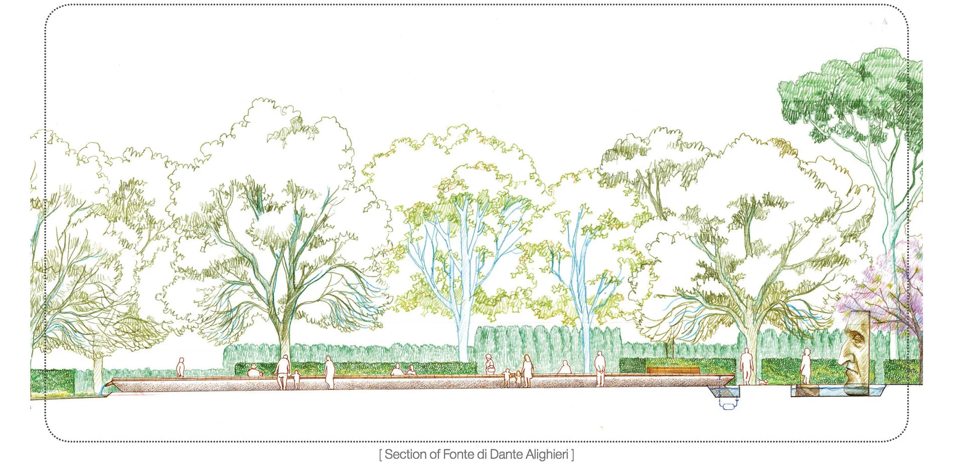 Additionally, a sculpture of the face of Dante Alighieri and a linear fountain (Fonte di Dante Alighieri) are designed in tackling the missing identity of the Piazza Dante Alighieri. Meanwhile, the linear fountain plays as a key guidance between the park and the piazza, with the typical Caen stone slates inscribed with etching of “Divine Comedy”.