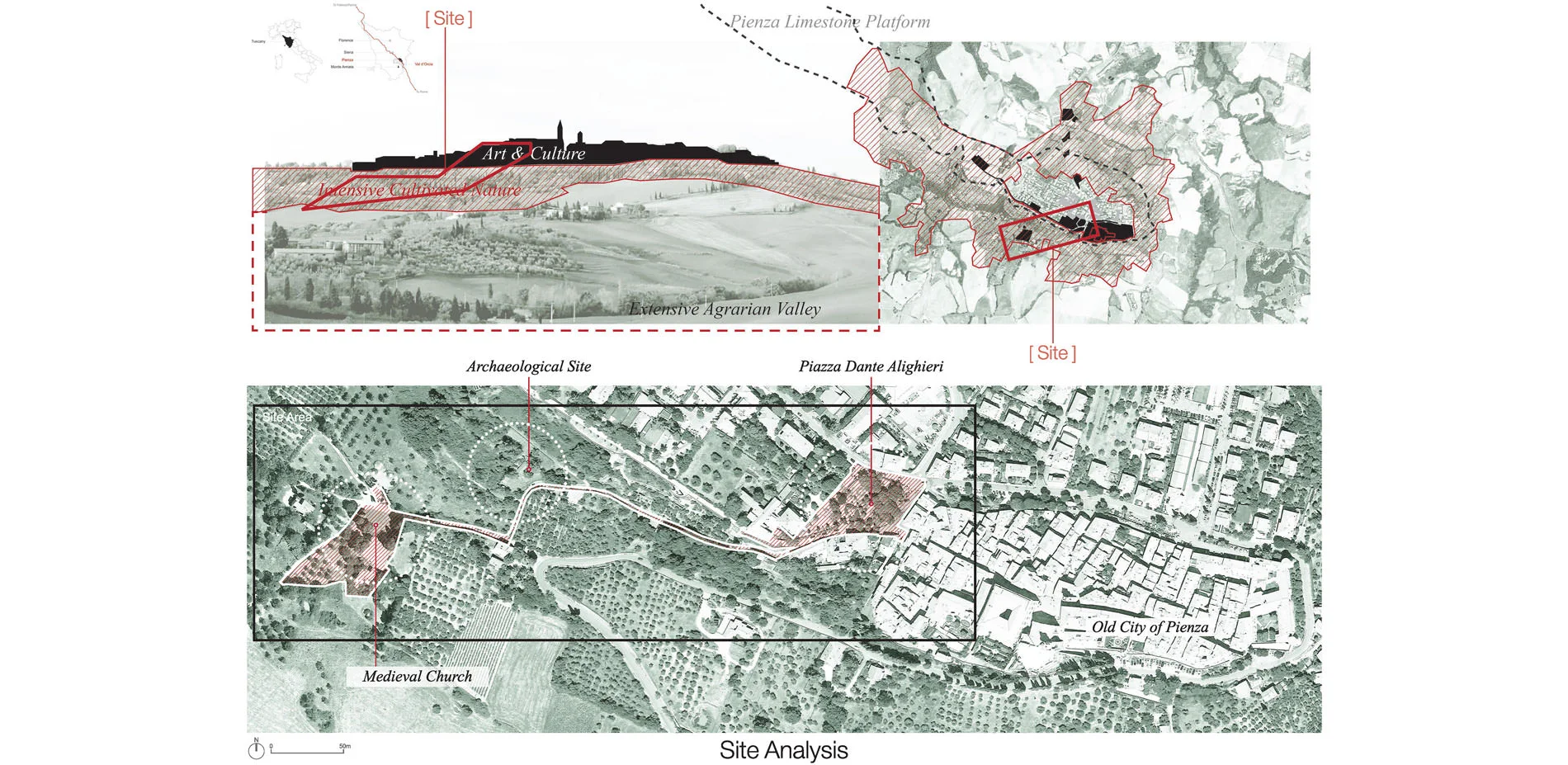 Today, as we are operating place identity of small towns with cultural and historical heritages, the biggest challenge is not so much of preserving the old as about conserving the historical values and collective memories in a continuous transition from the past, the present, to the future. This project aims at providing a hermeneutic landscape approach in balancing the historical conservation, local public life and tourism development by editing a part of historical percorsi1 (local trails) of Pienza, which stretch from a medieval church (Pieve di Corsignano), an archaeological quarry site to an urban piazza (Piazza Dante Alighieri) and the old city (Centro di Pienza).