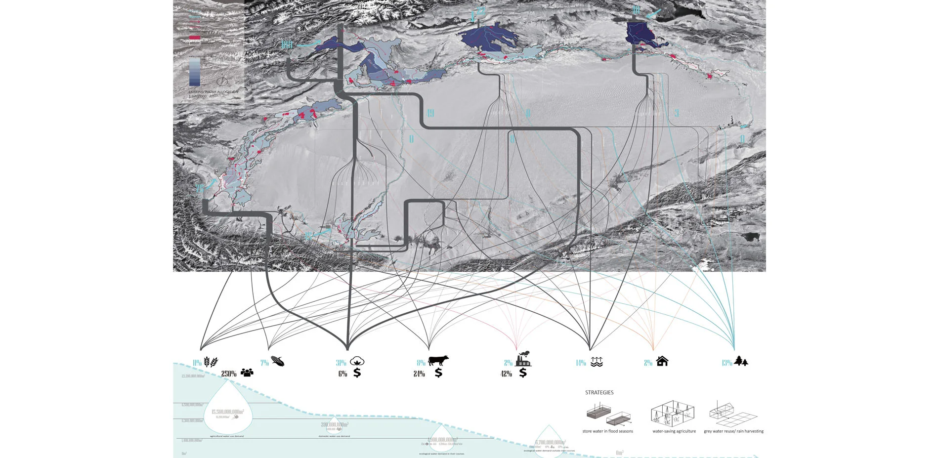 For the planning strategies, the 1st one is to build a store-release system. A series of underground reservoirs will be built along the seepage zones near the mountain. Working with reservoirs along the river, they’ll store extra water in flood seasons to recharge the riparian ecosystems and irrigate farmland in drought seasons. The 2nd one is to build a water-saving system. Grey water reuse strategies will be applied in settlement areas, and water-saving and high productive agriculture will be applied in large farmland matrix to save water and promote economy. The planning makes possibilities to connect the tributary to the river again.
