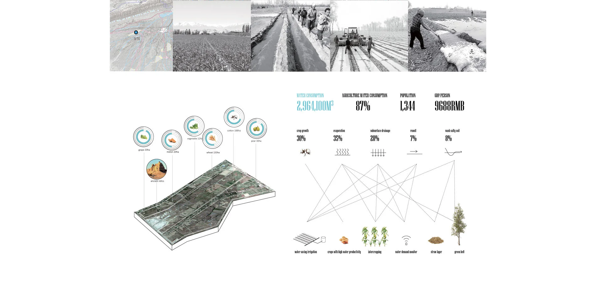 Zooming in the site, one of the farmland units in the planning site was selected to explain how the water-saving and high productive agriculture performs. Farms in the region is country-owned. The traditional agriculture applies flood irrigation, covers plastic film to reduce evaporation and plants crops with low water productivity, but just brings low income for local people. And only 43% of irrigation water is used to irrigate crops, other 57% is wasted. A considerable amount of water is lost by evaporation, runoff, subsurface drainage, wash salty soil, but not for crop production. Such loses of water from agriculture have major implication for not only to crop production, but also to movement of nutrients from agricultural fields to riverine environment and groundwater system. Any improvements in water use efficiency in agriculture increase the amount of water available for down steam users. Several strategies were applied on the site to deal with the water waste. They’re to apply water-saving irrigation, plant high water productive crops, build green belts, cover remote sensing system and apply intercropping planting method.
