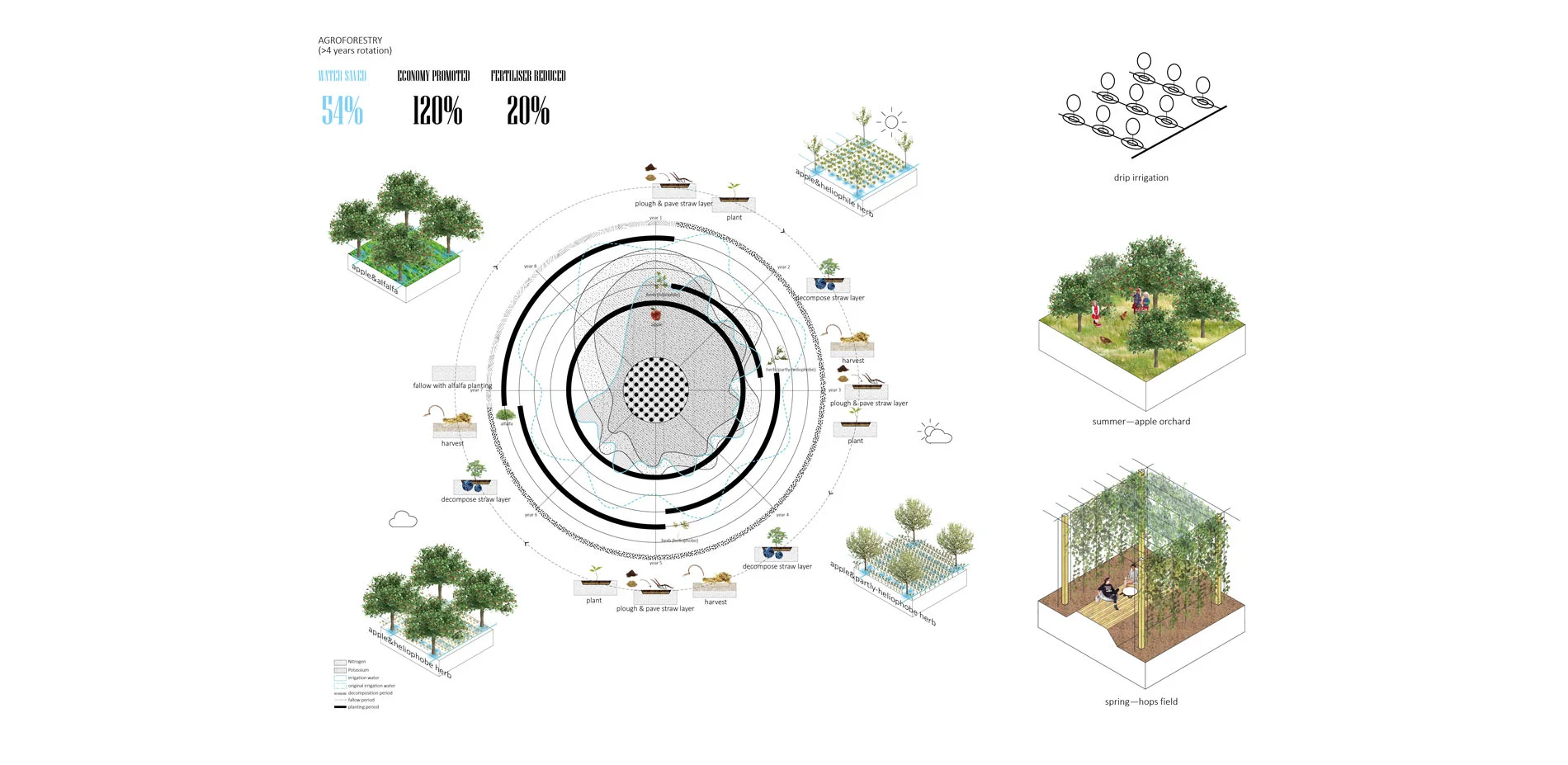 One of agroforestry typology designed on the site is apple trees with herbs in an 8-year crop rotation. Herbs will be changed with the growth of the apple tree canopies, and in the last 2 years, the under layers will be fallowed with alfalfa planting. Drip irrigation is also applied in this type. There’re also various programs in different seasons for local people. In this typology, 54% of water can be saved, economy can be promoted 120%, 20% fertilizers can be reduced.