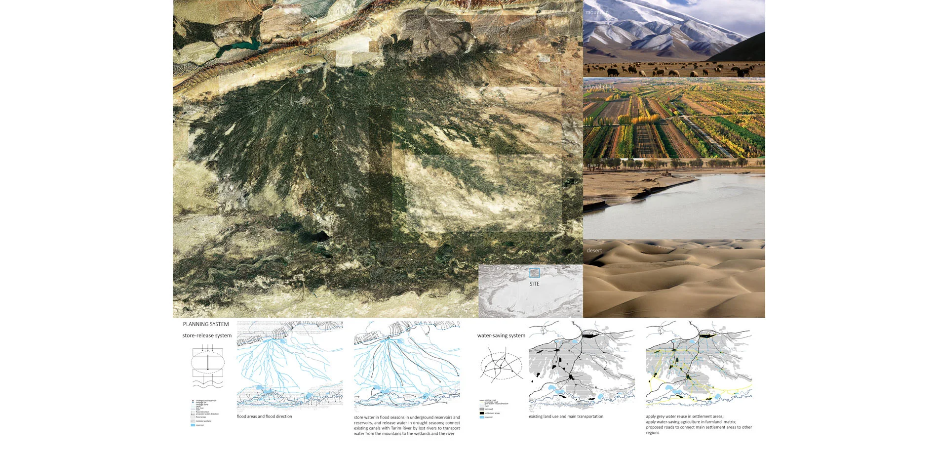 Zooming in the site, one of the tributary regions was selected as the planning scale site to delineate the strategies. The tributary has disconnected from the mainstream for several years, the region is from mountain region to fluvial plain, to Tarim River, finally to the desert from north to south. The flood seasons are from Apr. to Aug. every year, large areas of farms near the river and the mountain are flooded. In drought seasons, farms experience water scarcity, and much less water flows from upstream to down streams.