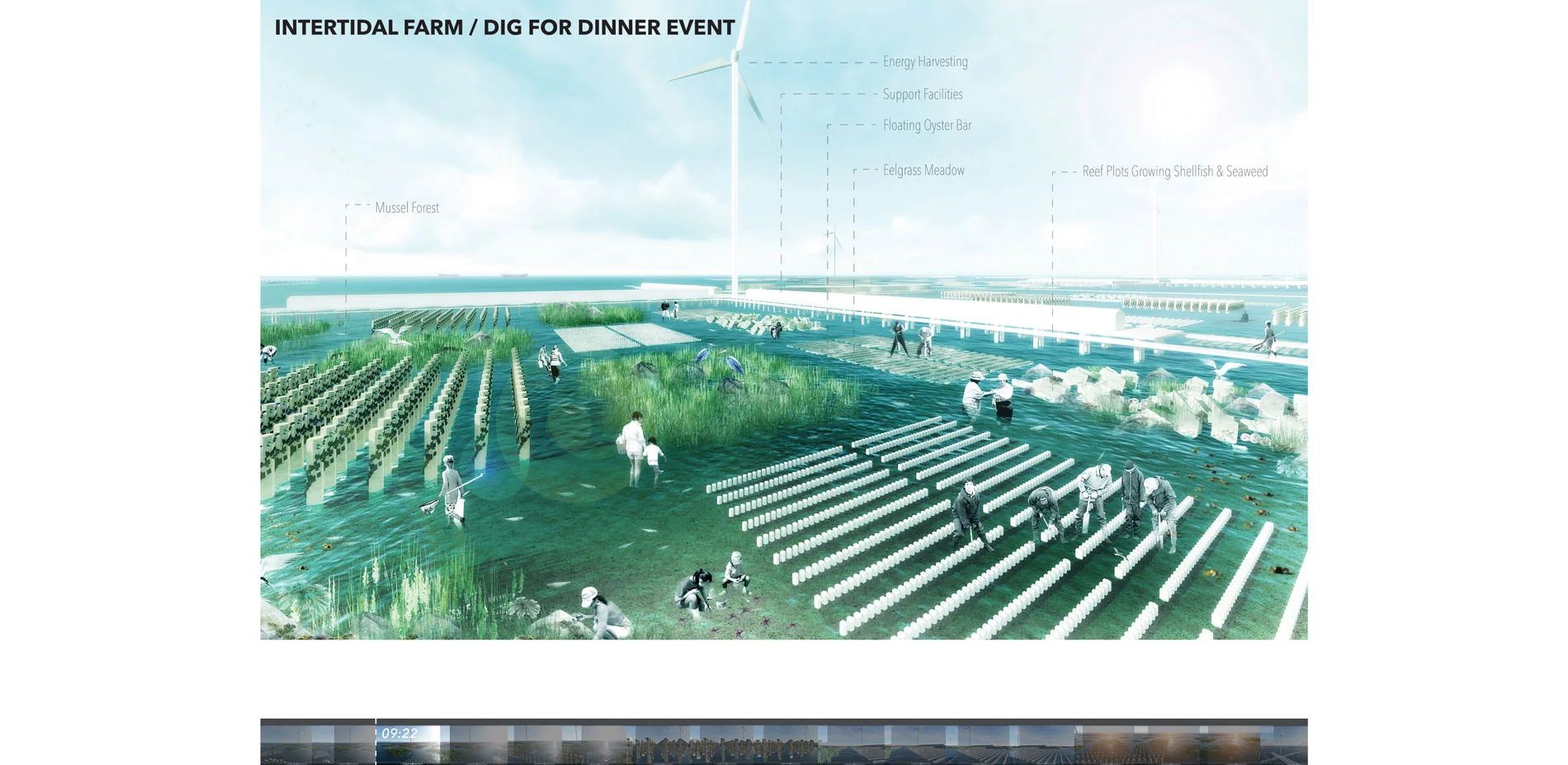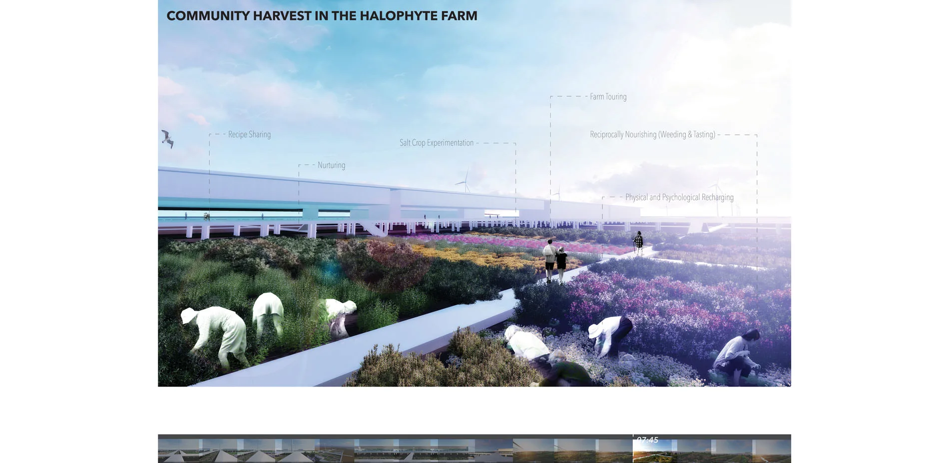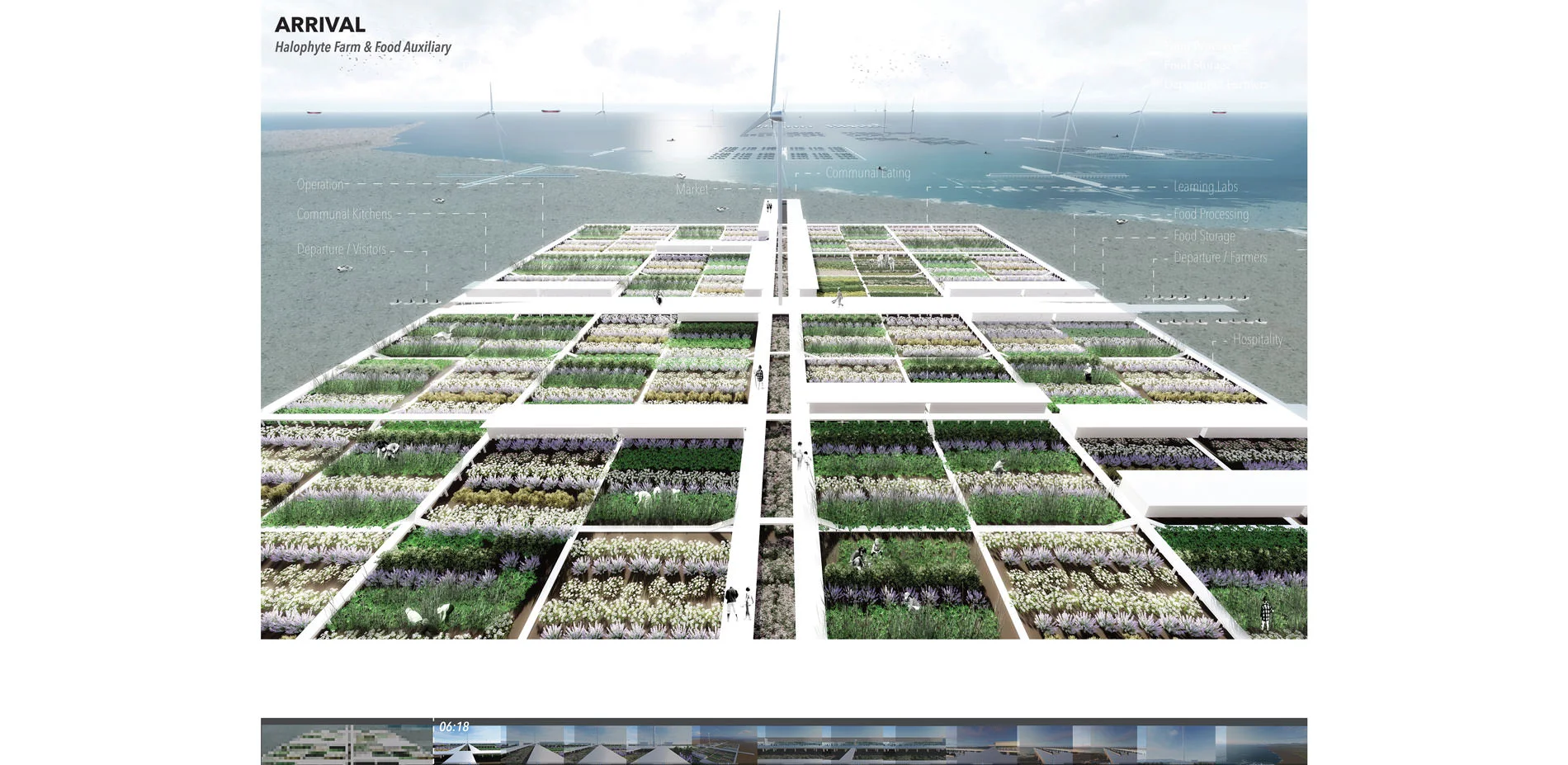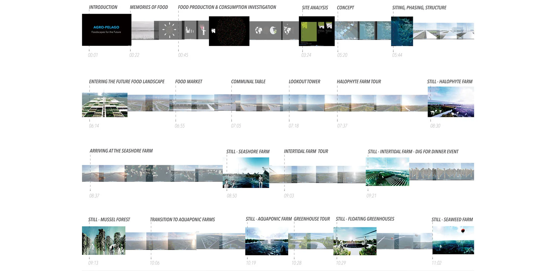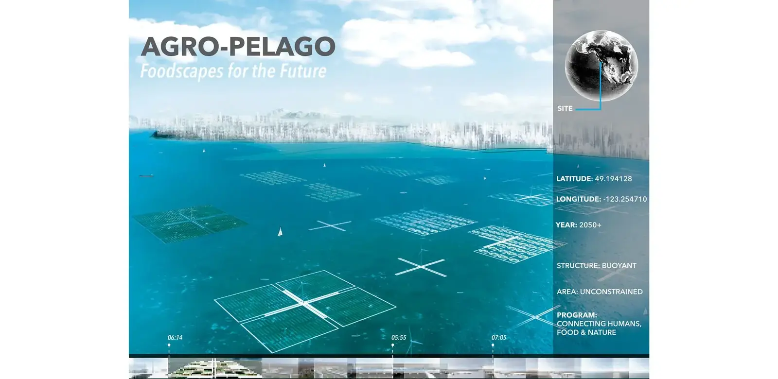 What if landscape architects could cultivate the sea to produce food? In the future, agricultural land in coastal areas faces extinction. Climate change and sea level rise floods farmland with salt water, unsustainable farming depletes soils, pollinators and crop varieties, and as land transitions from arable to urbanized, food security disappears. These threats present opportunities for landscape architects with collaboration amongst non-designers, multi-disciplinary industries and people across the globe to re-envision food landscapes for the future. Presented through film, Agro-Pelago explores a time when agricultural land in coastal regions is abolished and dense cities cannot find space for agriculture. Instead, future foodscapes embrace the cultivation of sea while becoming adaptable and resilient to time and context, and reconnecting humans with food and nature. Through film, animated infographics, diagrammatic drawings, narration, sound, and 3d modeling capture atmospheric and experiential qualities of a proposed future food landscape. The film activates awareness, collaboration, innovation and dialogue between the landscape architecture community, multi-disciplinary industries, non-designers and the broader public so together we can look towards the future of food.