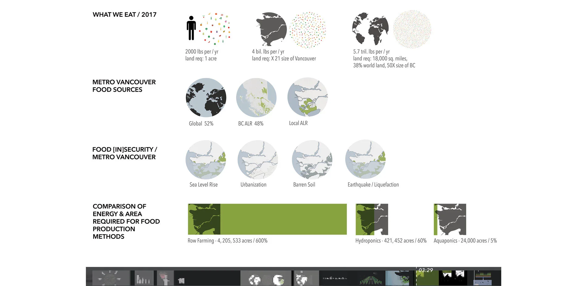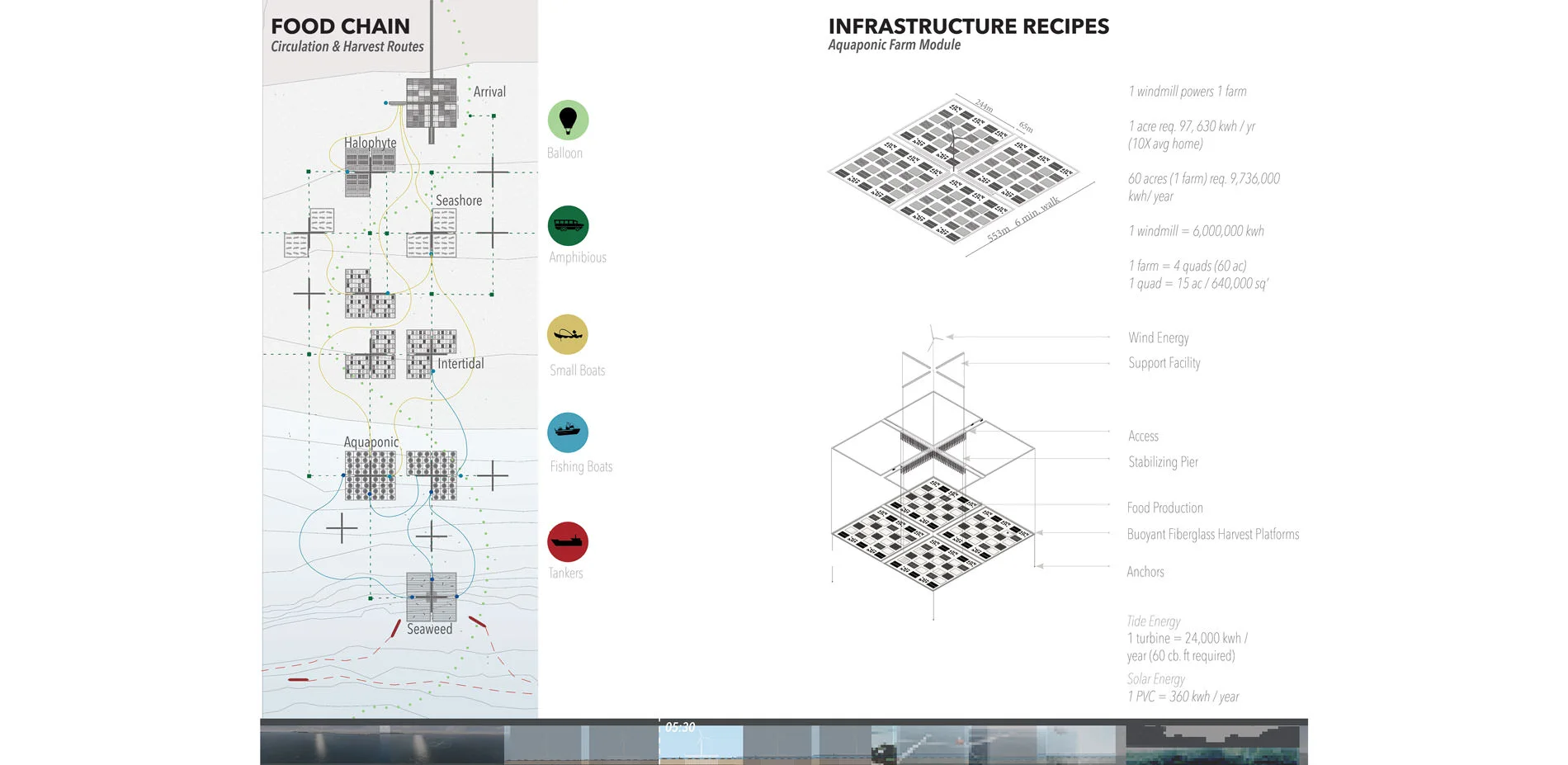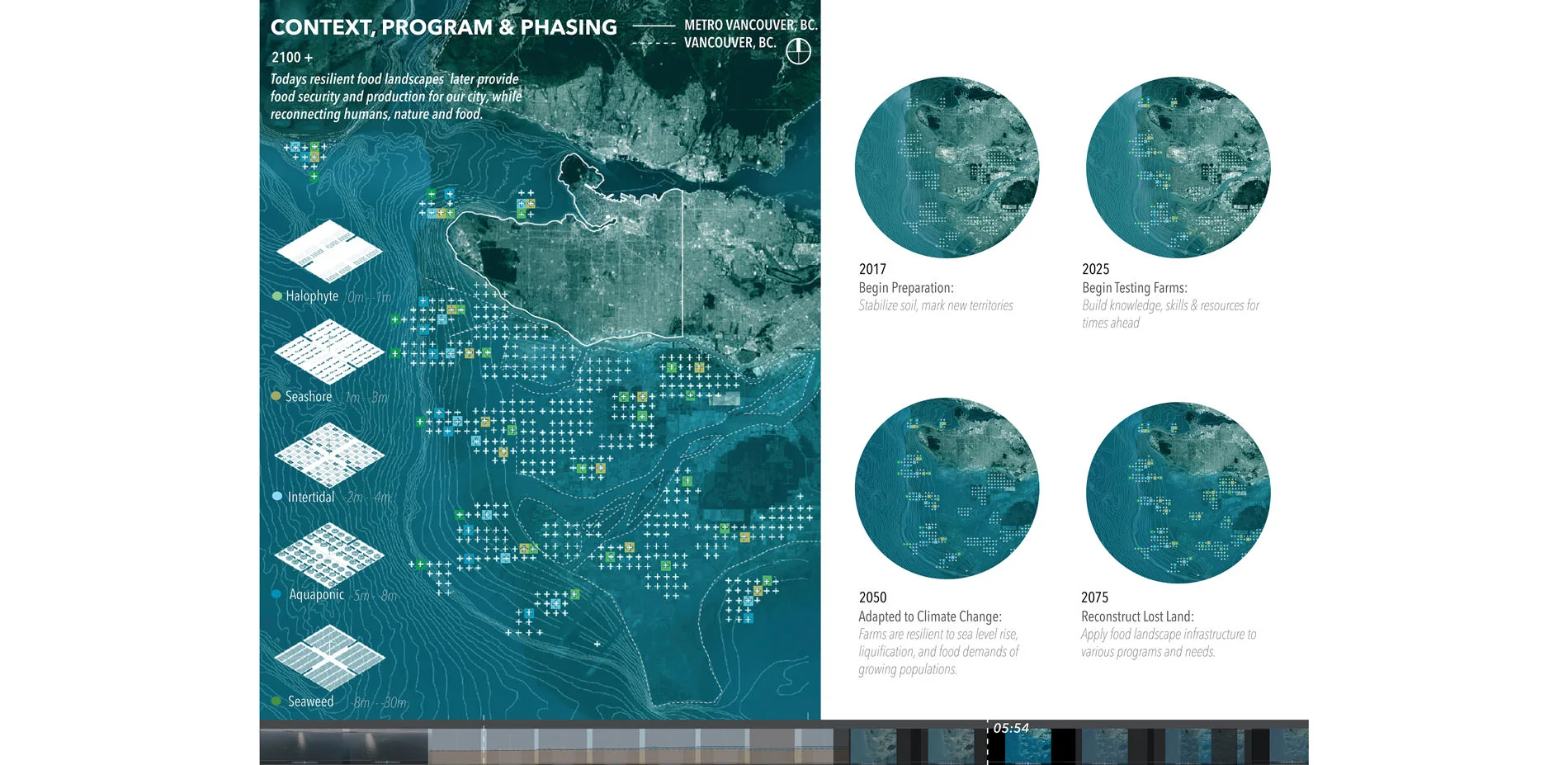 AUDIENCE: The Agro-Pelago film has a limitless audience and speaks to people across the globe, as food production and security is a world-wide challenge. The film is a tool used to communicate this to a wide audience facing various existing and projected food production challenges. The film outlines how these challenges are of critical importance to address to ensure food security, and the opportunity this presents for landscape architecture resolutions. The film uses various methods of motion picture representation to activate awareness, collaboration, innovation and dialogue amongst the landscape architecture community as well as non-designers, multi-disciplinary industries and the broader public. The digital and easy to understand film can be shared online amongst students, professionals, and schools and welcomes viewers of all ages. Having no physical or tangible boundary, it has a limitless audience. Similarly, while the project features a coastal, futuristic food landscape, the relationship it advocates between humans, food and nature, and the importance for food production and security are themes which address people across the globe, amongst generations. Through a landscape architecture perspective, the Agro-Pelago film invites its audience to come together, to celebrate food and nature, and to begin looking innovatively toward the future of food and its timely potential for landscape architecture. PLOT The films introduction contextualizes the project using narrated, animated infographics. Located in Metro Vancouver, it presents intensive research and investigation into food production, consumption and security in a condensed, easily understandable manner. Memories of food in historic times are compared to todays fading relationships between humans and food. Here, the film sparks a discussion about future food landscapes not only within the landscape architecture community, but welcoming to non-designers, other professions, and people of all backgrounds and disciplines of which the subject of food applies to. The film then communicates various threats coastal food landscapes face in the future including sea level rise and salt water flooding low lying agricultural lands, urban development replacing valuable farmland, the intensive energy and spatial requirements needed to operate agricultural facilities, and the damaging impacts of unsustainable farming practices such as use of fertilizers and pesticides depleting soils, pollinators and crop varieties. Following, animated diagrammatic drawings illustrate how these challenges equally present opportunity for landscape architecture interventions and describe the projects concept and goals. Here, a future food landscape is proposed which responds to the projects background research, analysis and investigation, perceiving its unveiled challenges as opportunities for imaginative, innovative design solutions and the evolution of todays food production capabilities for future scenarios. Accepting a time when agricultural land has been lost and dense cities can no longer make space for agriculture, the project unfolds innovative ways to produce food in coastal regions for the future. Inspired by aquaponics and embracing both land and sea into food production, Agro-Pelago proposes the creation of a new site which has never before existed. Sited in various depths of water, a series of future farms embrace todays food production threats, including sea level rise and flooding, and explore the potential for salt water agriculture. In shallow waters, halophyte farms cultivate salt loving crops. Seashore and intertidal farms produce shellfish and seaweeds. At subtidal depths, crops float above water in indoor greenhouses with local fish farmed below. At greater depths, constructed kelp forests create a new industry of seaweed farming. Wind, solar and tide energy is harvested for autonomous operation and to power the surrounding city. As new territories are cultivated to produce food for human consumption, they dualistically create new habitats and ecologies, welcoming humans and nature to cohabit the landscape and discover the joy and reward in working together.
