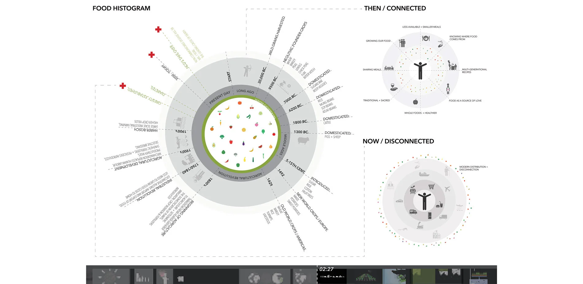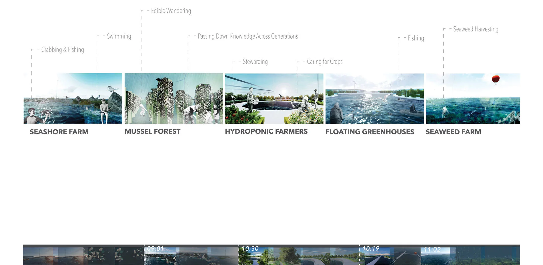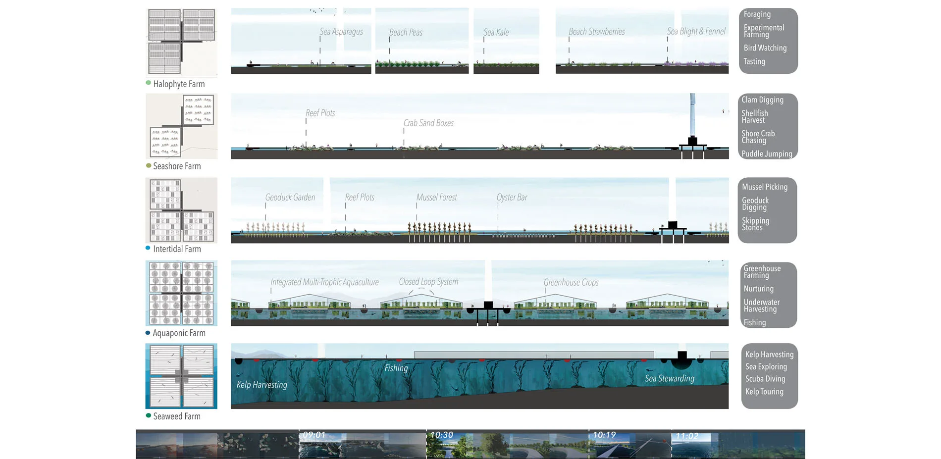 AUDIENCE: The Agro-Pelago film has a limitless audience and speaks to people across the globe, as food production and security is a world-wide challenge. The film is a tool used to communicate this to a wide audience facing various existing and projected food production challenges. The film outlines how these challenges are of critical importance to address to ensure food security, and the opportunity this presents for landscape architecture resolutions. The film uses various methods of motion picture representation to activate awareness, collaboration, innovation and dialogue amongst the landscape architecture community as well as non-designers, multi-disciplinary industries and the broader public. The digital and easy to understand film can be shared online amongst students, professionals, and schools and welcomes viewers of all ages. Having no physical or tangible boundary, it has a limitless audience. Similarly, while the project features a coastal, futuristic food landscape, the relationship it advocates between humans, food and nature, and the importance for food production and security are themes which address people across the globe, amongst generations. Through a landscape architecture perspective, the Agro-Pelago film invites its audience to come together, to celebrate food and nature, and to begin looking innovatively toward the future of food and its timely potential for landscape architecture. PLOT The films introduction contextualizes the project using narrated, animated infographics. Located in Metro Vancouver, it presents intensive research and investigation into food production, consumption and security in a condensed, easily understandable manner. Memories of food in historic times are compared to todays fading relationships between humans and food. Here, the film sparks a discussion about future food landscapes not only within the landscape architecture community, but welcoming to non-designers, other professions, and people of all backgrounds and disciplines of which the subject of food applies to. The film then communicates various threats coastal food landscapes face in the future including sea level rise and salt water flooding low lying agricultural lands, urban development replacing valuable farmland, the intensive energy and spatial requirements needed to operate agricultural facilities, and the damaging impacts of unsustainable farming practices such as use of fertilizers and pesticides depleting soils, pollinators and crop varieties. Following, animated diagrammatic drawings illustrate how these challenges equally present opportunity for landscape architecture interventions and describe the projects concept and goals. Here, a future food landscape is proposed which responds to the projects background research, analysis and investigation, perceiving its unveiled challenges as opportunities for imaginative, innovative design solutions and the evolution of todays food production capabilities for future scenarios. Accepting a time when agricultural land has been lost and dense cities can no longer make space for agriculture, the project unfolds innovative ways to produce food in coastal regions for the future. Inspired by aquaponics and embracing both land and sea into food production, Agro-Pelago proposes the creation of a new site which has never before existed. Sited in various depths of water, a series of future farms embrace todays food production threats, including sea level rise and flooding, and explore the potential for salt water agriculture. In shallow waters, halophyte farms cultivate salt loving crops. Seashore and intertidal farms produce shellfish and seaweeds. At subtidal depths, crops float above water in indoor greenhouses with local fish farmed below. At greater depths, constructed kelp forests create a new industry of seaweed farming. Wind, solar and tide energy is harvested for autonomous operation and to power the surrounding city. As new territories are cultivated to produce food for human consumption, they dualistically create new habitats and ecologies, welcoming humans and nature to cohabit the landscape and discover the joy and reward in working together.