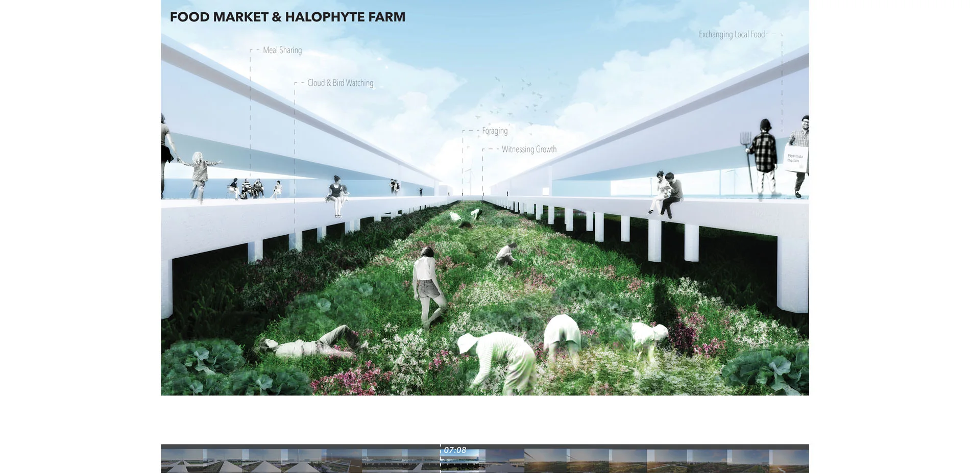 MESSAGE: While focusing on future food landscapes, the film questions the role of design in the future for landscape architects, urban designers, and architects amongst various other professions, non-designers, and the public. It addresses global, future challenges such as climate change affecting food production and the demand for resource consumption posed by growing populations, and asks how future landscapes can help relieve the critical need for resources, such as food, while equally serving as places for recreation, leisure, social and cultural exchange. Importantly, it explores future scenarios when new territories must be cultivated for human survival, such as for food production, and the opportunity this presents for the profession of landscape architecture. Similarly, it inspires the audience to begin imagining the cultivation of not only land in the future, but unexplored geographies such as sea and air. Another important message is how these problems are approach and reimagined through the lens of landscape architecture and how this lens benefits both the environment and those who inhabit it. The film sparks a discussion about the relationships between humans, food and environment amongst a universal audience. The proposed foodscape celebrates an equal exchange between humans and nature and inspires us to question how humans can give back to the landscapes which we take from. In the future when the cultivation of new territories is critical for human survival, can we equally create new habitats and ecologies to reciprocally nourish the environments which support us?