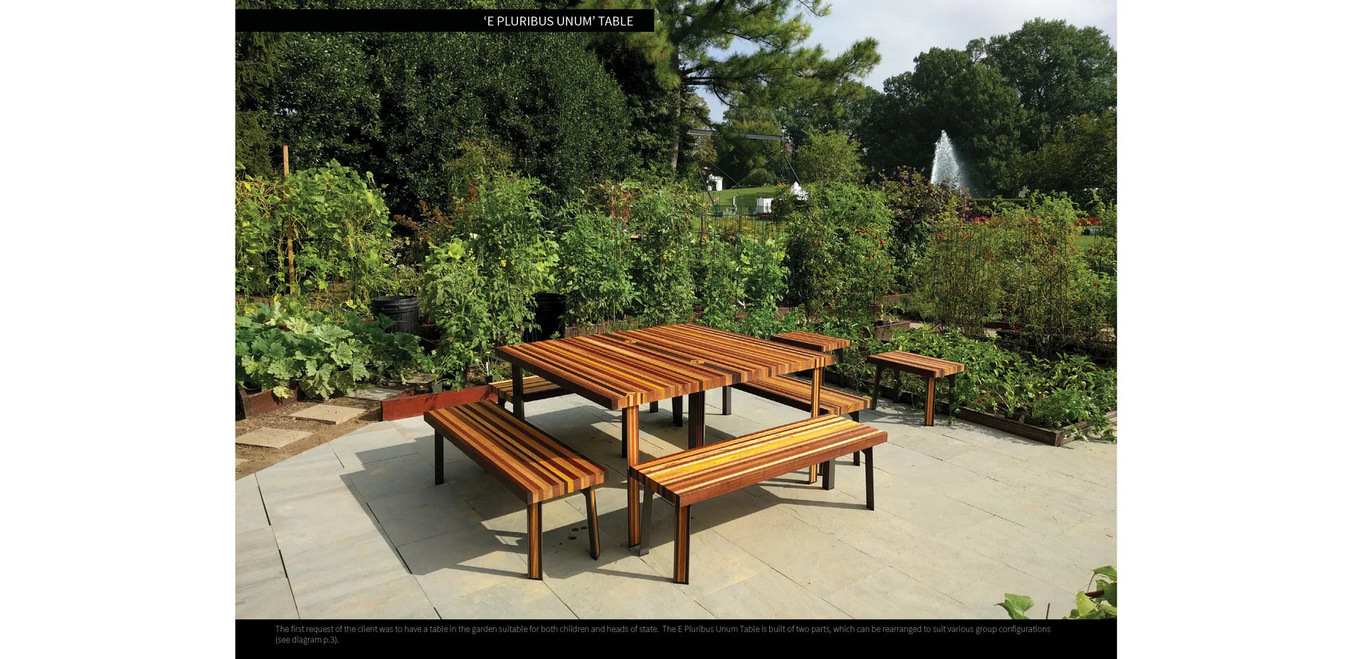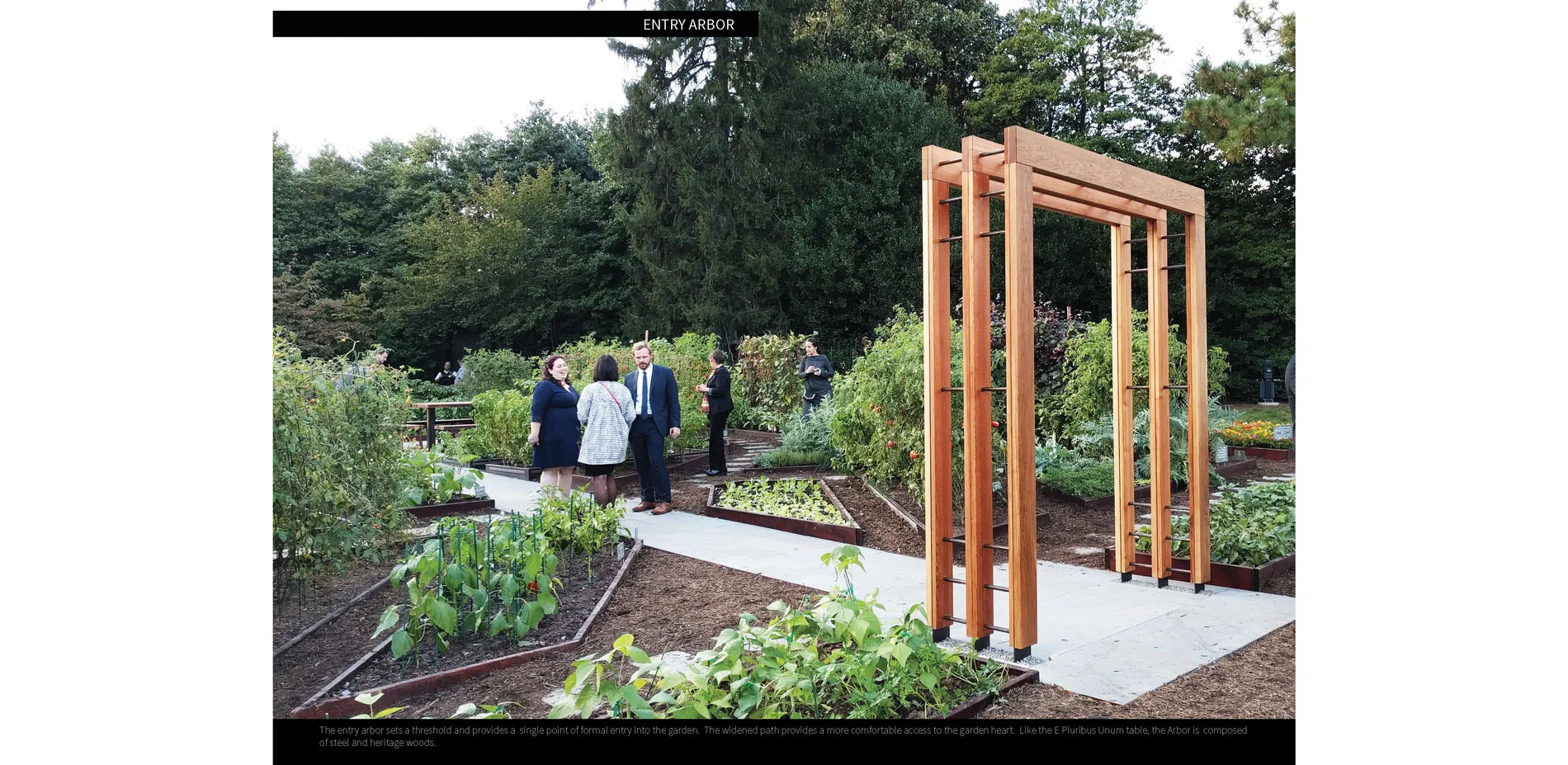 Starting in June, the design team undertook a thorough analysis of the current garden configuration and cycles of activity within the garden to fully understand how to enhance the garden with a goal of making it more formalized and ‘set in stone’ projecting a sense of permanence. Already a highly successful and productive garden, we determined that the designs had to be meaningful, subdued, and precise. Each design move was rooted in the themes of gathering, harvesting, and celebrating the unifying ‘E Pluribus Unum.’