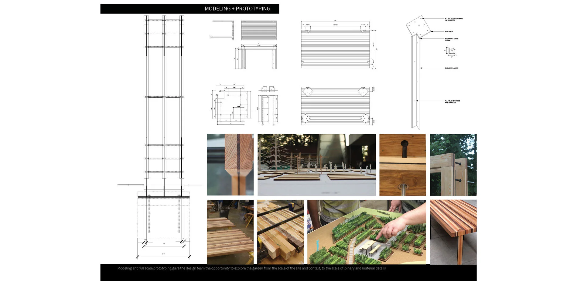 Our team was comprised of six students. Two of those students were Masters of Landscape Architecture students, two students were Masters of Architecture students, and two were undergraduate Architecture students. Throughout the project, collaboration between team members was a driving force of the creative process. Group meetings were held a few times a week, and students worked in close physical proximity to one another. For the majority of the project, the group worked as a team, sharing modeling, drawing, designing and prototyping responsibilities. Each student brought their own schooling, outside skills and experiences to the project. Experience in construction was a skill shared by almost everyone in the group. All students shared an interest in materiality and assembly. Site layout was the result of collaboration. Towards the end of the project, tasks were divided more. One undergraduate Architecture student was primarily responsible for creating a booklet to document our work, assisted later by a Masters of Architecture student. For the final prototype of the table and arbor, the two Masters of Architecture students and one Masters of Landscape Architecture student did the majority of the construction work, and helped build the pieces that are installed. The second Master of Landscape Architecture student was responsible for the rendered site plan and graphics.