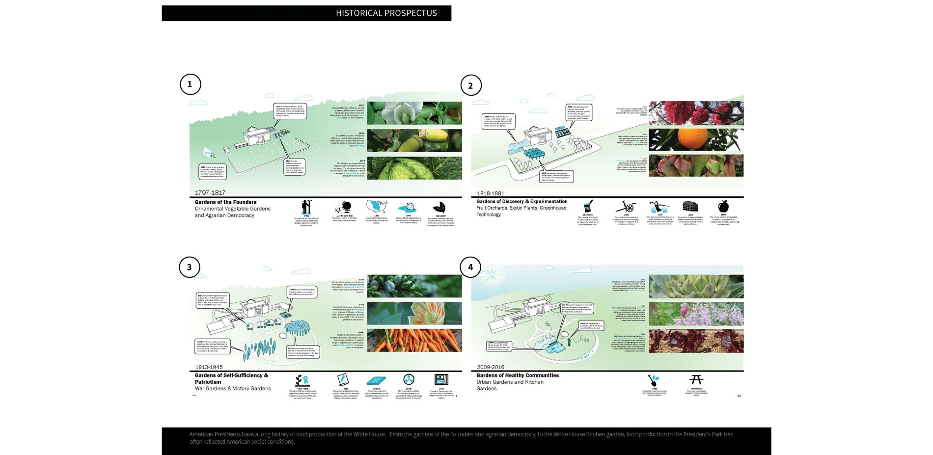Because food gardens are seasonal, the plant architecture of the White House Kitchen Garden changes throughout the year. The design considers the garden parameters in the spring, summer, fall, and winter.