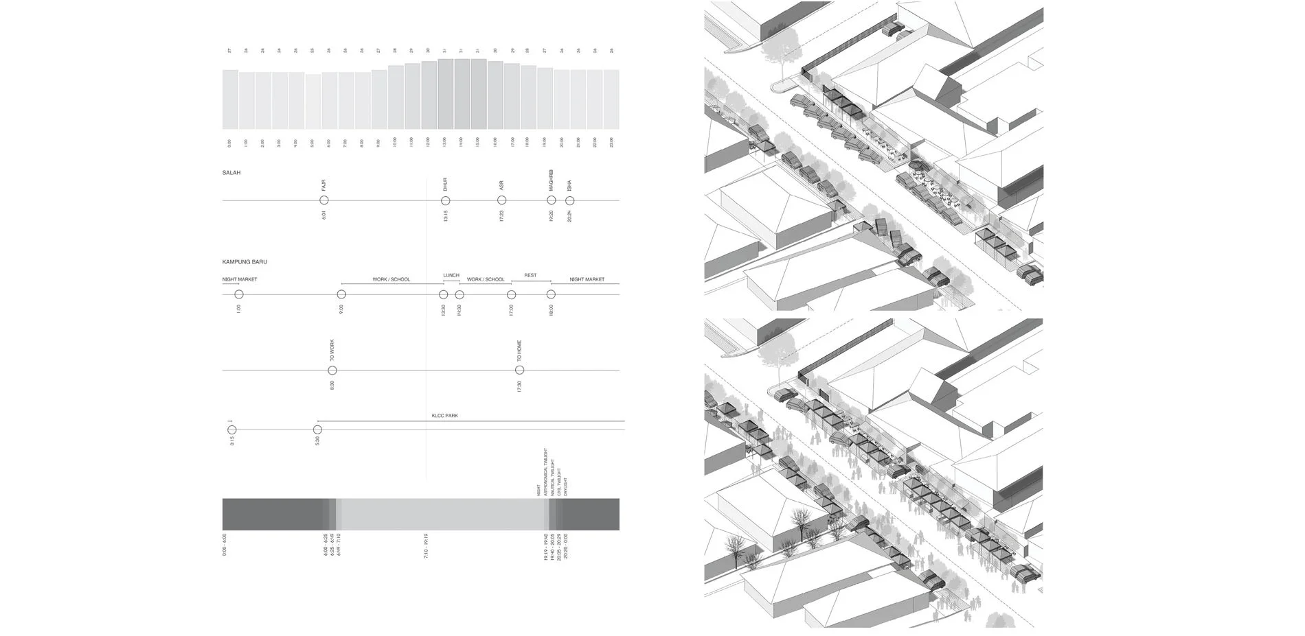 The project aims to breakdown the immense effect of urban shock the Petronas Towers have had on the community. While the structures themselves are new and taller, they help to provide the community members with a set of guidelines and rules that will help the proposed structures better fit into the community and reduce the immediate and long-term shock. What is the future rolee of architecture and landscape architecture when it comes to community preservation in the face of rapid urban development? We are those charged with designing new spaces and developments for all. We have the ability to speak for those who may not have a voice in their communities. And we have the capability to ensure that the systems, structures, and infrastructure both physical and metaphorical that are the backbone of a culture, community, or society are preserved and even championed over the shallow ambitions of others.