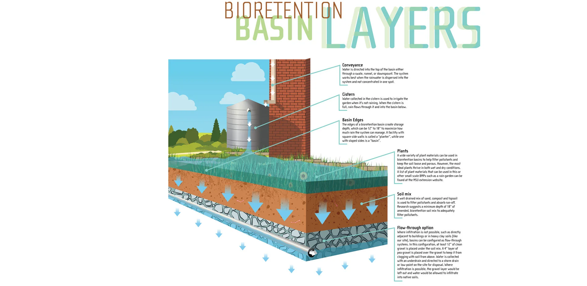The project team consisted of 10 landscape architecture students, 10 graphic design students and 1 civil engineering student. The project was designed and built in three phases. First, the landscape architecture students worked with the civil engineering student to size, design and build the basic basin structure. The basin was designed to fit within the framework of an existing academic courtyard. Therefore, the overall shape and materials were dictated by contextual site materials. In order to be more sustainable, recycled concrete block was used behind a limestone veneer to reduce the use of the locally sourced stone. By the end of this phase, the individual layers of the rain garden were installed from underdrain to mulch.