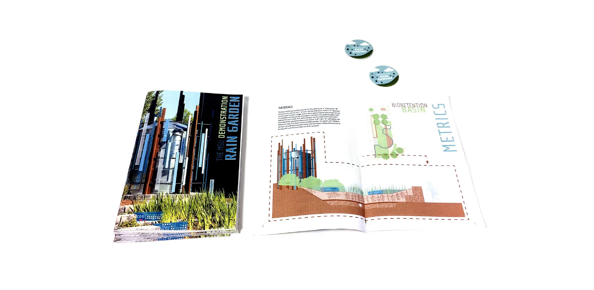 - Lastly, a booklet, available online and in print, explains the rain garden in more detail for visitors taking lessons home. The booklet targets a wide audience from novices to experienced professionals. It repeats all of the communication levels represented at the site, and also includes additional design details and process images.