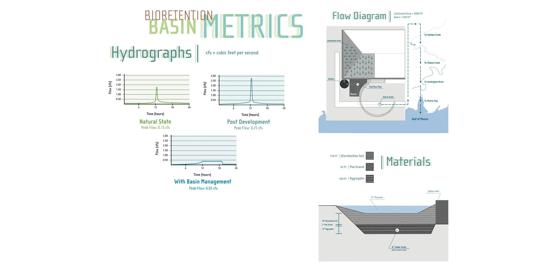 - A series of three Technical Diagrams convey more detailed information for current and future design professionals. They are focused on visitors knowledgeable of stormwater management design details. The first provides hydrographs of the pre, post and managed condition of the roof area being managed. The second provides a technical cross-section with depths and quantities of each basin layer. The third is a diagram of how water moves from the roof ultimately to the Gulf of Mexico. This diagram is particularly successful in placing the project in a larger watershed context.