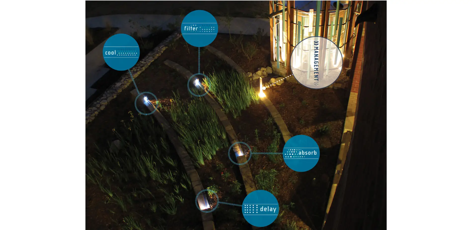 - The last step of the Flow Diagram is “management”, where water enters the rain garden. Below this marker, four Management Diagrams represent the four major functions of a rain garden. The words (delay, cool, absorb, and clean) are placed along the weirs in the garden. Each panel uses a series of dots of different sizes, colors and spacing to reinforce the action of the word.