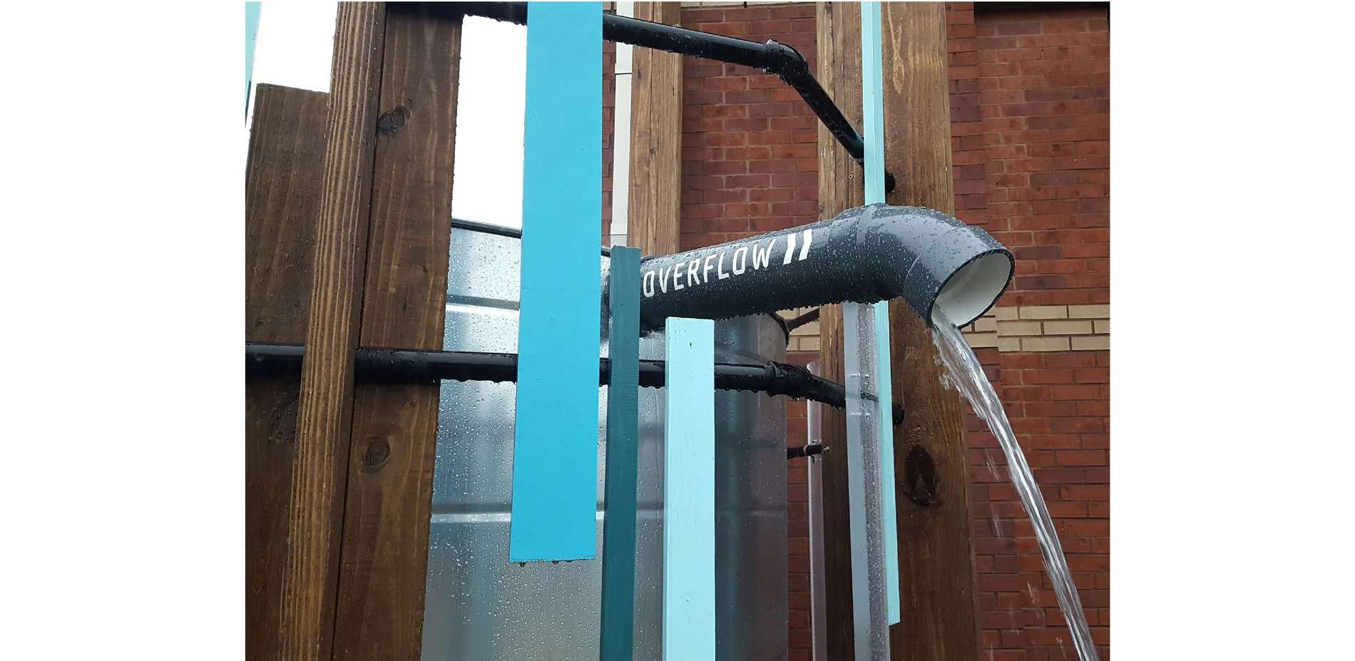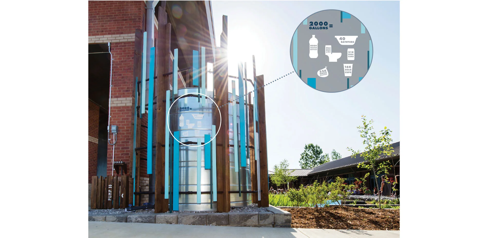 - As an art piece, the cistern enclosure references the movement of rain and helps to identify the garden to visitors. Diagrams on the cistern help to relate the large volume of water stored in the 2,000 gallon cistern. These diagrams add a layer of interest to the garden and are fun for all ages to see and include the equivalent amount of water in water balloons to bath tubs.