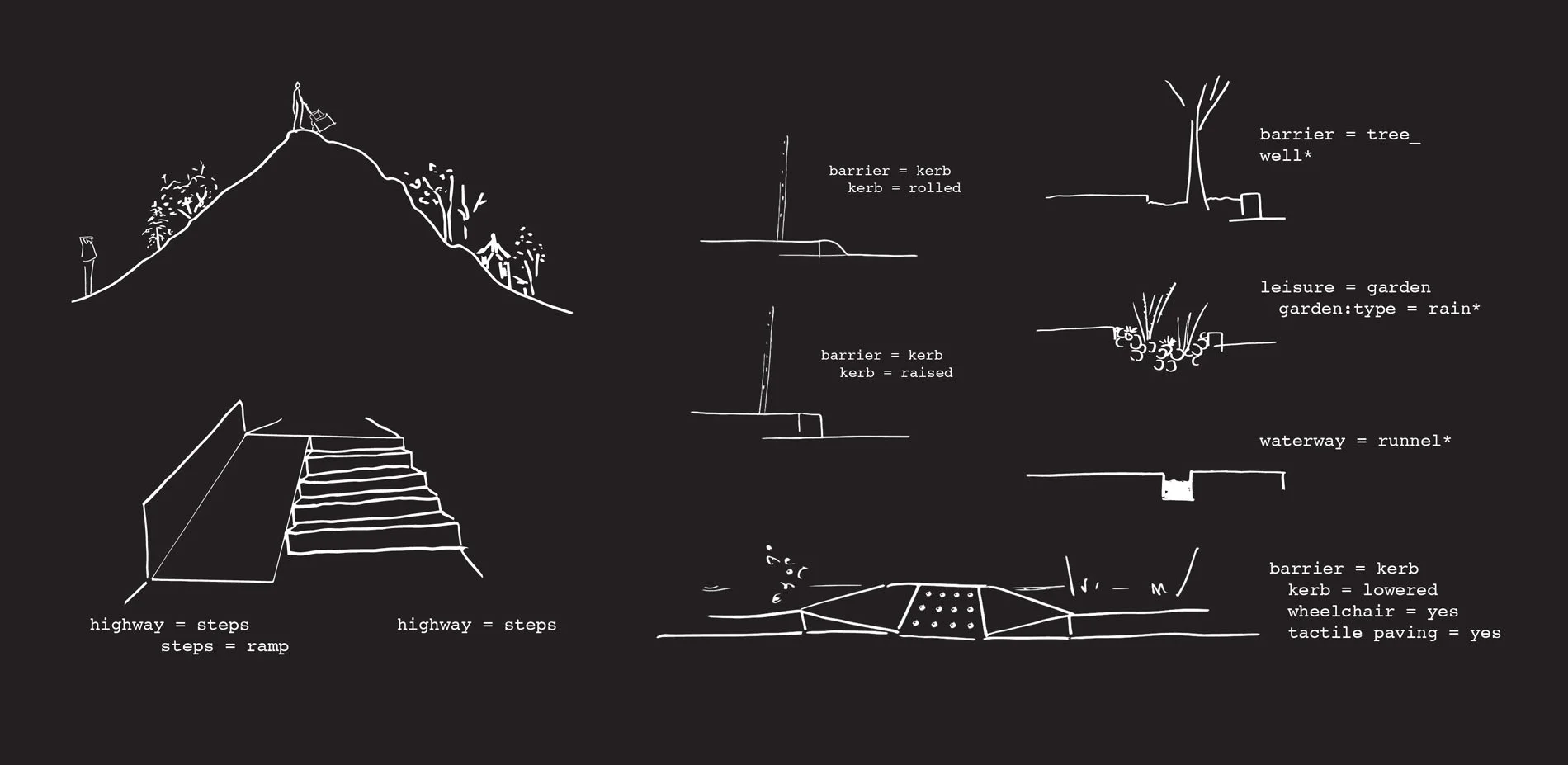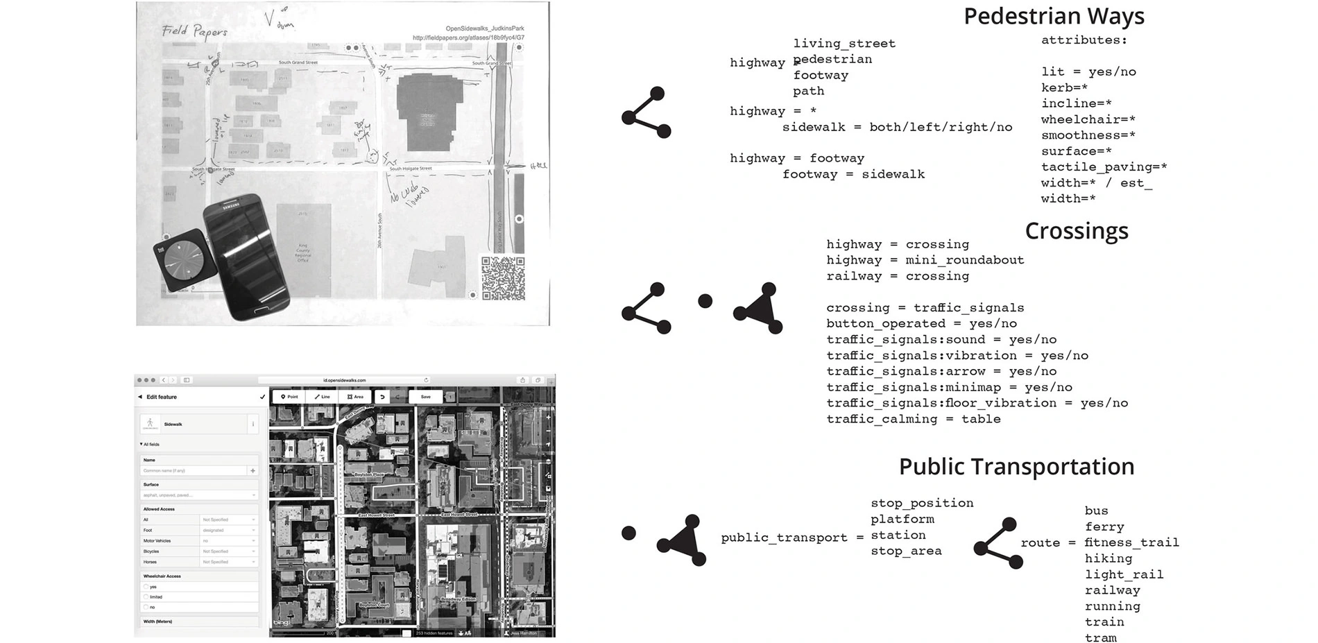OpenStreetMap was chosen for it’s extensive global coverage and easily extendable data schema. This platform allows for the project to easily pull from a large existing data pool, while also making it simple enough to fill in informational gaps as they pertain to pedestrians.