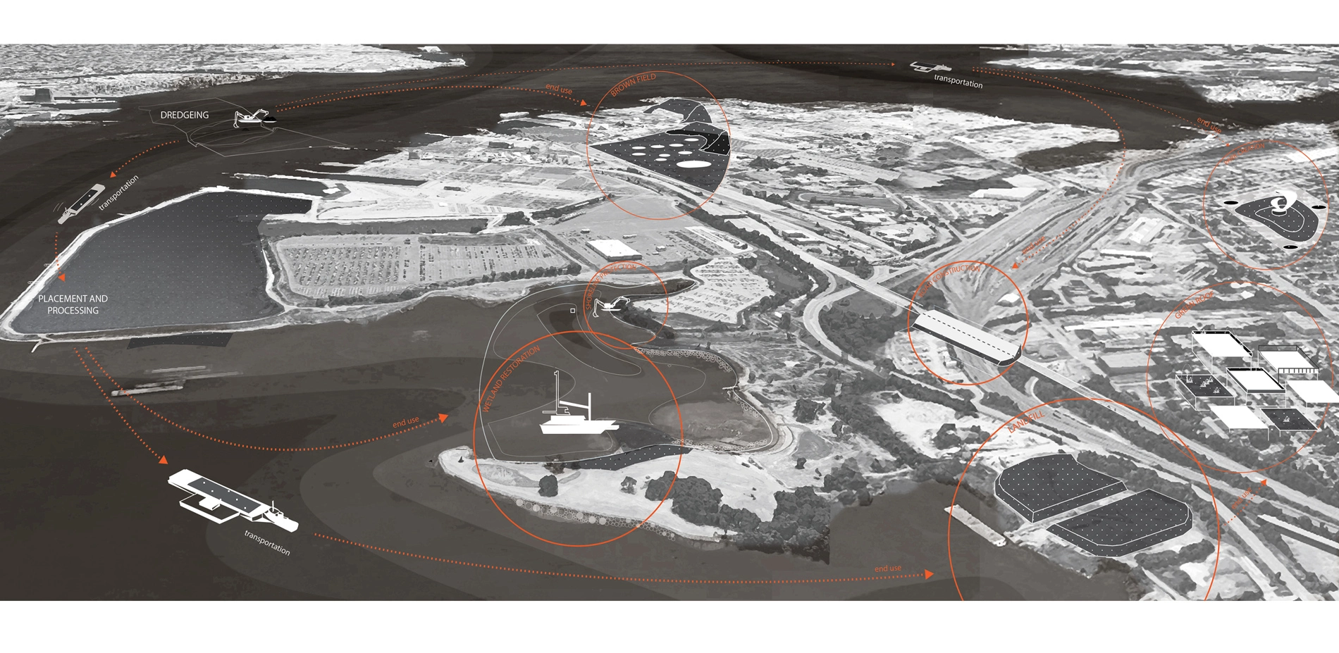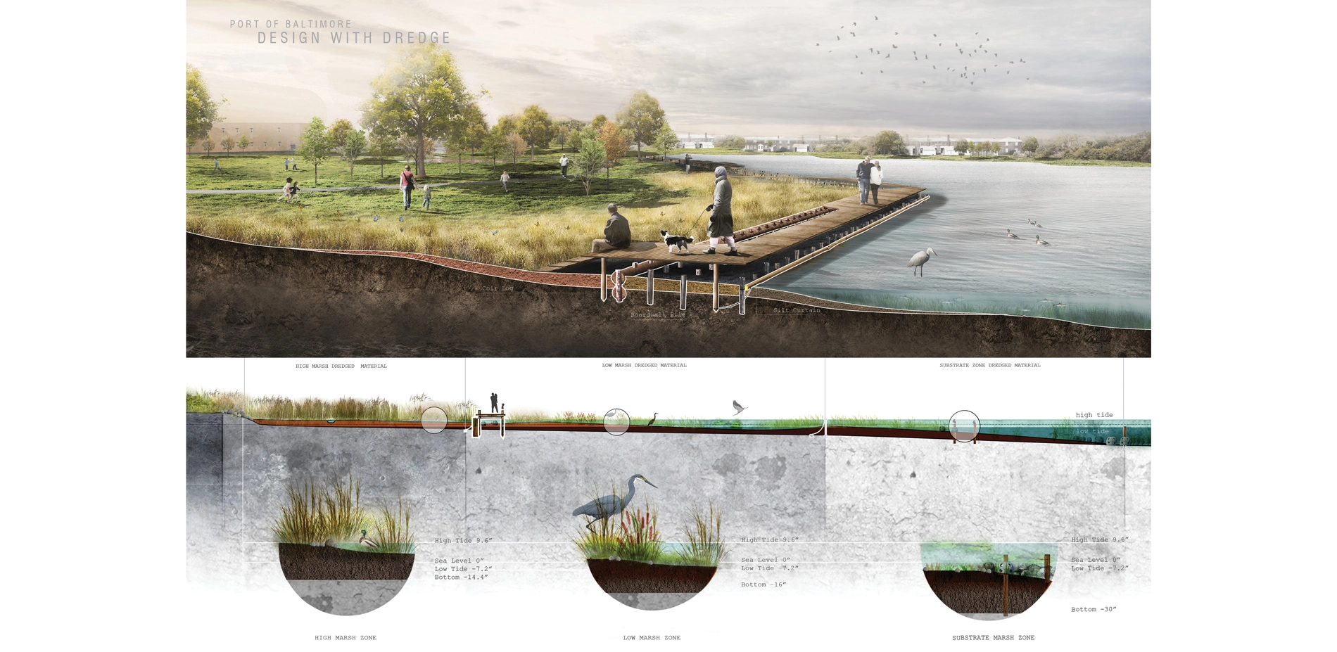 Every year in the Baltimore Harbor natural and anthropogenic siltation processes infill waterways and navigation channels, necessitating the removal of 1.5 million cubic yards of sediment to keep the port operating. The Design with Dredge research program brings together practitioners, community members, academics, regulatory and policy officials, and industry representatives to advance shared conceptual frameworks, planning priorities, and applied landscape strategies for resilient dredged material management in the Baltimore region. Through cross-disciplinary collaboration, compound research methods, and direct stakeholder engagement the program provides a lens through which to explore emerging and future landscape infrastructure issues facing port cities and coastal communities. It also serves as a medium for material investigation and a cooperative paradigm for engaged civic action. In recasting the clays, silts, sands, and gravels of the Baltimore Harbor as a substrate of resiliency, Design with Dredge is catalyzing the institutional and operational energy and knowledge of diverse stakeholders to reimagine what it means to live in a dynamic urban estuary where legacies of labor, innovation, and ecological justice overlap.