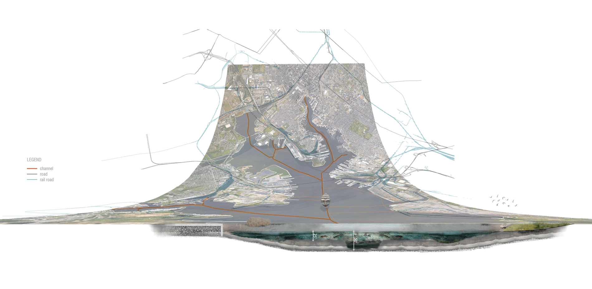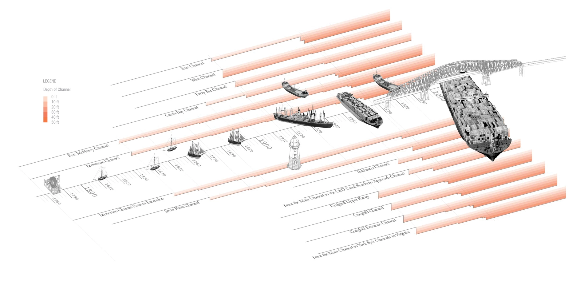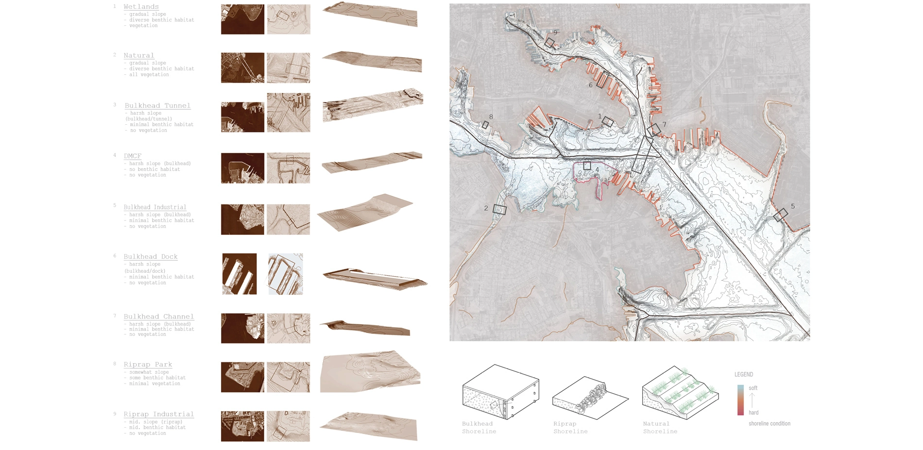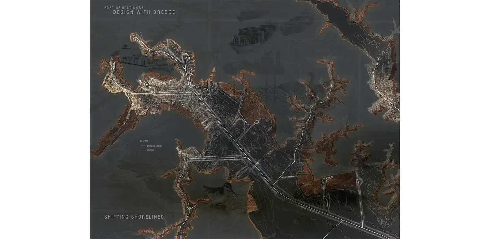 As such, each of the methods and products of the research project were tailored to investigate and articulate dredged material as an essential element in the culture, economy, and ecology of the Baltimore Harbor and Chesapeake Bay estuary, as well as a critical resource in regional resiliency and landscape infrastructure. Both qualitative and quantitative methods were used to chart variable dimensions, relationships, and potentialities of dredged material in time and space. Cartographic projections, deep sections, and system mapping reveal the prevailing dig and dump mentality that has shaped and reshaped the shoreline and benthic environment of the upper and middle branches of Patapsco River in service of monolithic industrial ends. Regional sediment mapping and evaluation of existing dredged material placement capacity makes clear the need for alternative management strategies as sediment sources flowing into federal navigation channels begins to eclipse the rolling placement capacity of sediment sinks. Under these circumstances, normative landscape criteria serve as fulcrum for synthesis; integrating technical, cost, and values-based considerations into a holistic framework for collaborative and engaged action. This Design with Dredge umbrella provides the conceptual and organization vessel to work across scales and disciplinary boundaries bringing the expertise of ecologists, engineers, regulators, industry, academics, and practitioners into a deliberate mode of applied inquiry. Regional and national case studies documenting advanced dredged material management practices provide signposts for synthesis and springboards for creative cross-disciplinary thinking. Whereas, local shoreline typology studies offer insights into existing conditions and opportunity sites.
