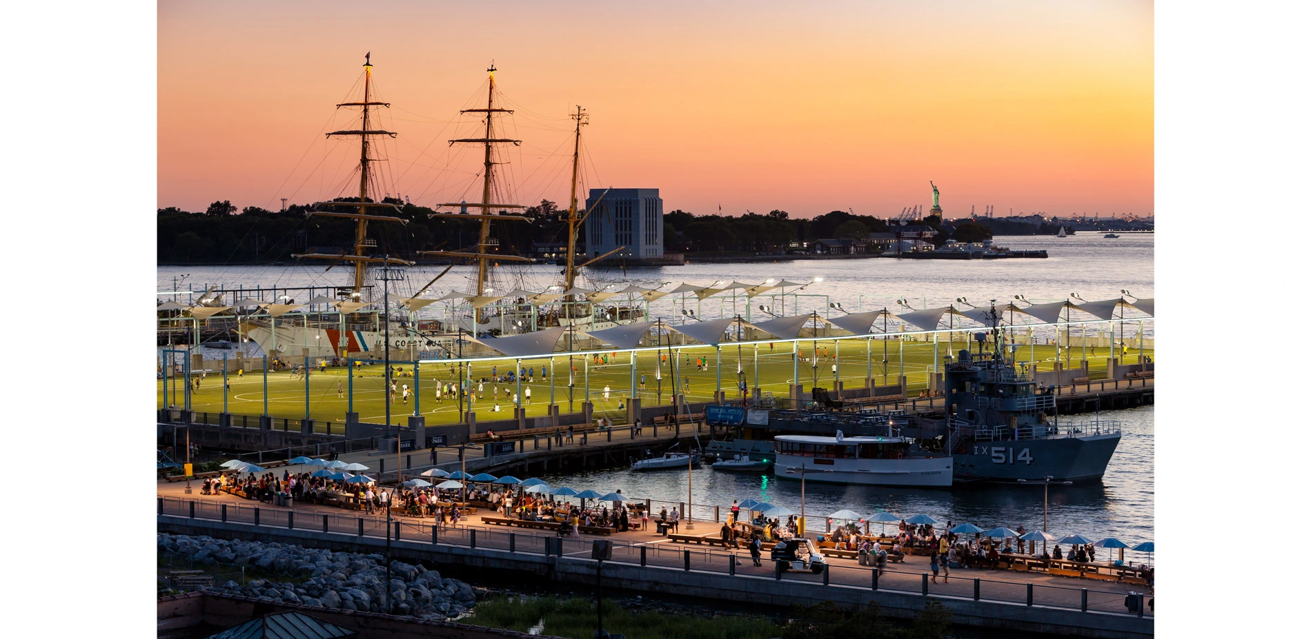 Transforming the industrialized shoreline was a challenge for the designers, but they also found opportunities in the remnant port infrastructure. Extensive structural analysis revealed which of the existing piers were salvageable and what uses they could accommodate. Much of Pier 1 was on fill, rather than structure; this area could support dramatic topographic interventions, including a sloped event lawn sculpted from subway construction spoils, while its more vulnerable pile-supported component was removed and the embankment carved back to create the salt marsh. Piers 2 and 5, both relatively stable, were devoted entirely to turf sports fields and hard courts, optimizing their programmatic potential without overburdening their carrying capacity. Fragments of former warehouses on these piers were repurposed as structures for shelter and lighting.
