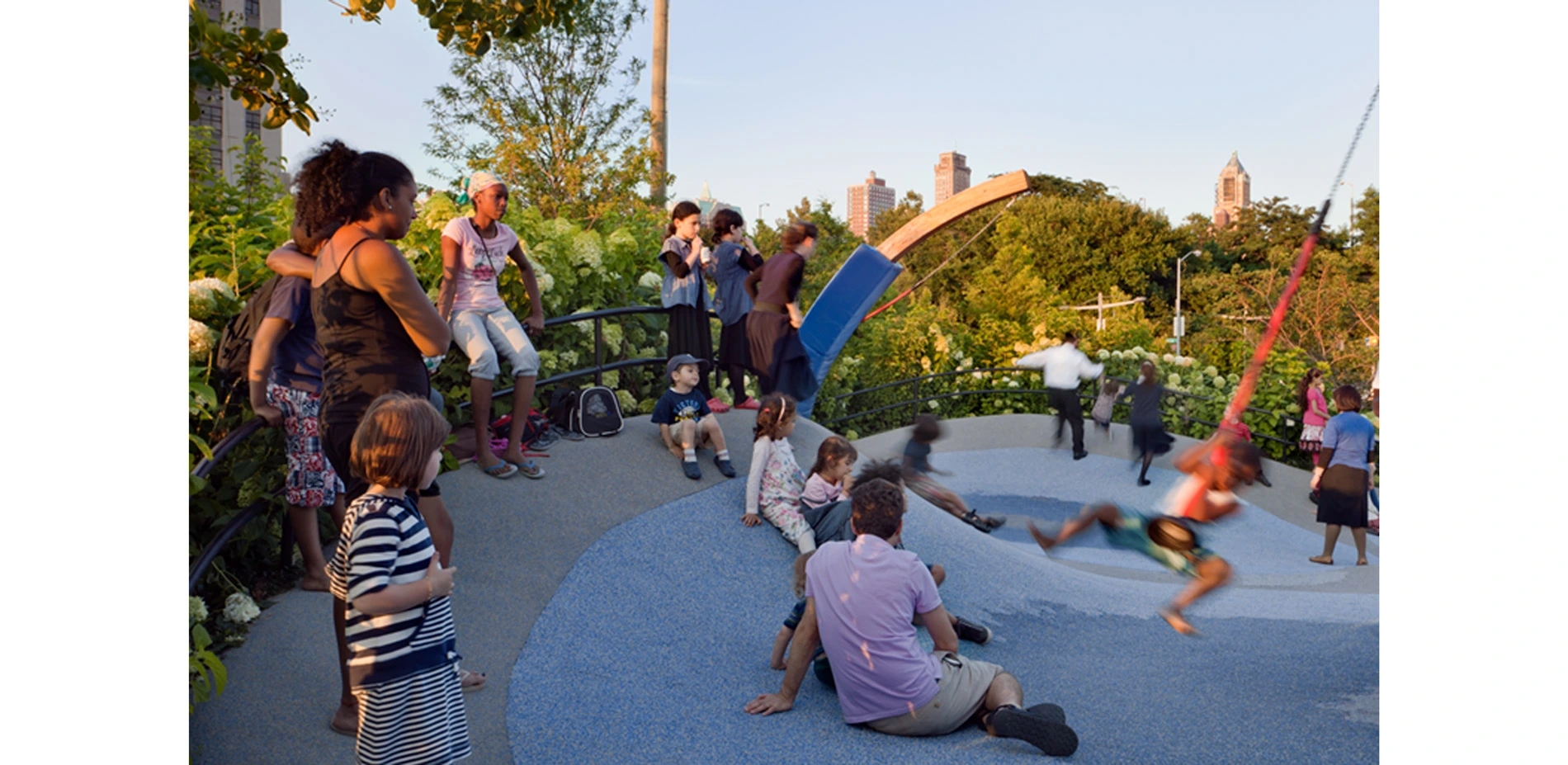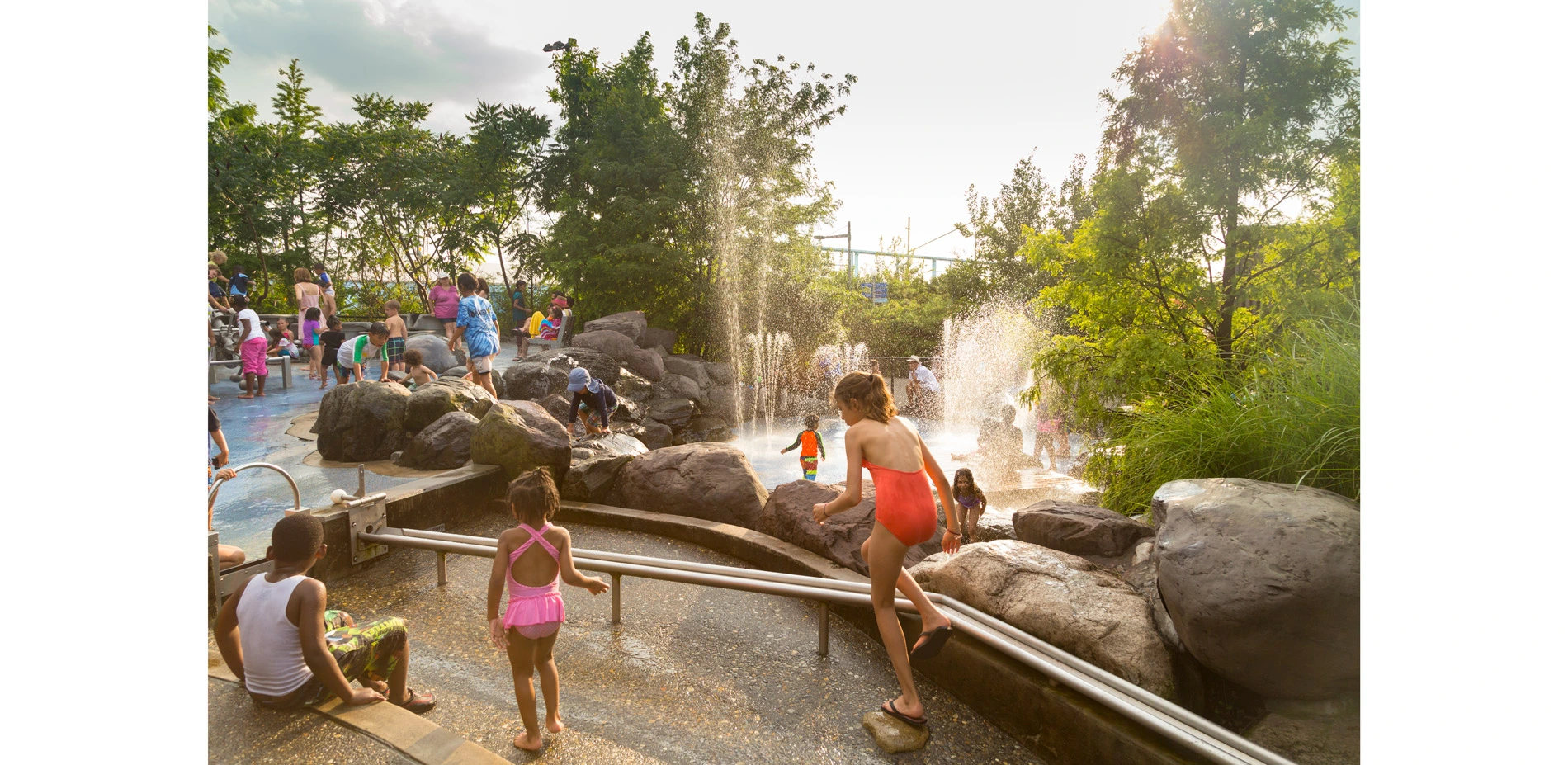 Integrated with intensely programmed areas is a generous mix of landscape experiences, including dense wooded hedgerows, salt and fresh-water wetlands, pastoral shaded greens, and child-size play forests. These living landscapes are shaped by a commitment to responsible use of resources, with species selected for tolerance to urban conditions, salt spray, heavy winds, and periodic saltwater inundation. A large share of the park's irrigation demand is met through reuse of site stormwater. Hedgerow and understory areas are densely planted with small-caliper trees and shrubs, easing establishment and allowing natural succession to determine a well-adapted species composition over time. Since 2010 the designers have worked closely with park gardeners and horticulturalists to maintain and improve the many plant communities as they mature.