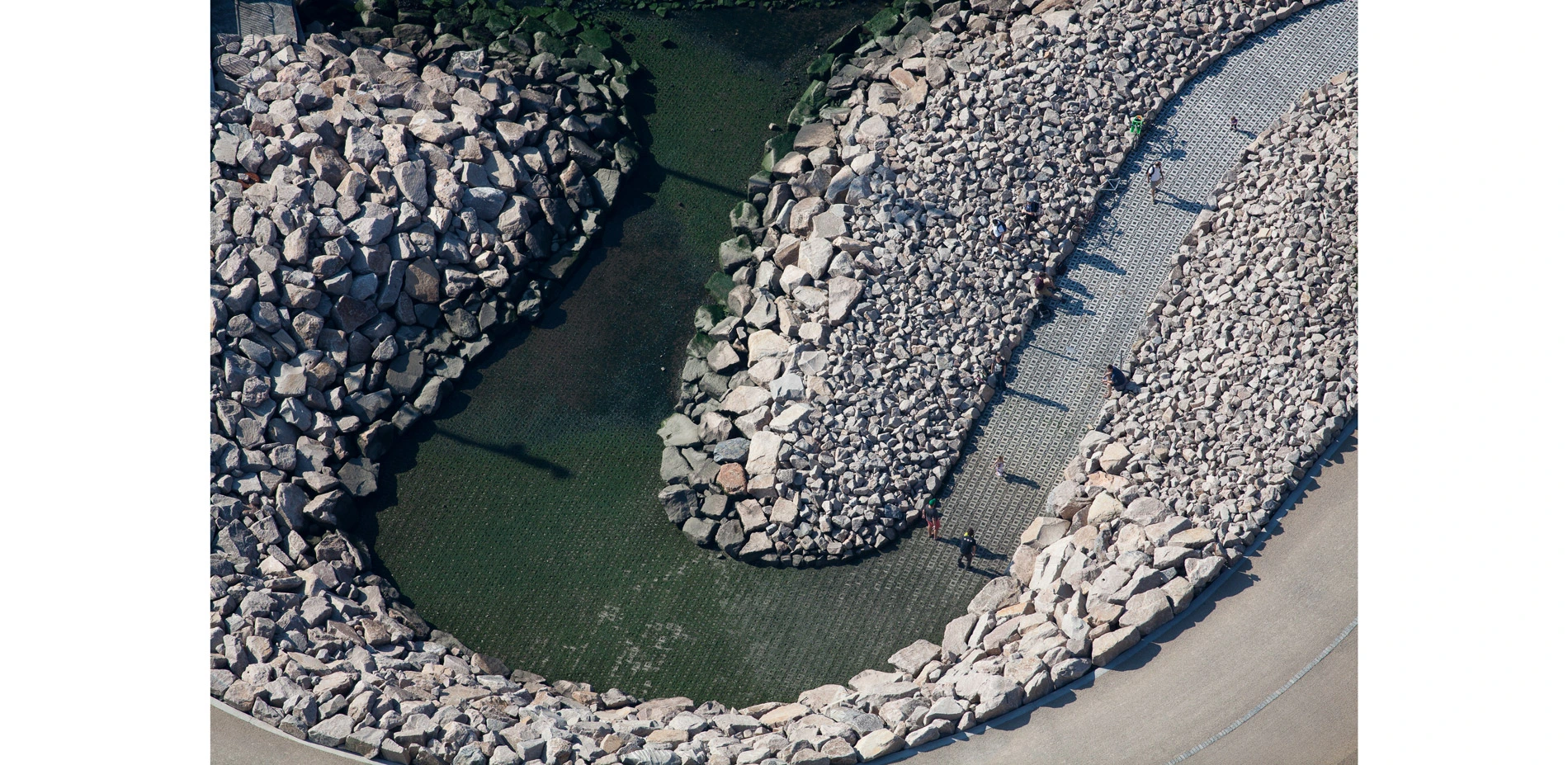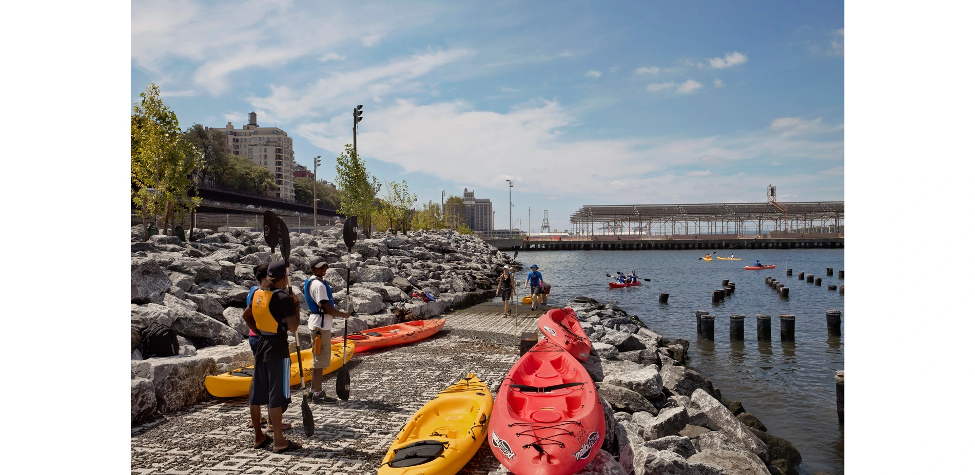 The designers also understood that the park must be durable, as the low-lying site faces daily tidal pressures and occasional storm-driven floods of the East River. Synthesizing programmatic and resiliency goals yielded a palette of new edge types that enhance experience while improving environmental performance. Stone riprap banks became an especially versatile tool. Riprap is inexpensive and better than impervious walls at absorbing tides and storm surges, and it can be sculpted into a myriad of usable forms. Lending a material coherence to the entire site, it provides informal seating, steeply graded slopes for boat launches and abrupt elevation changes, sheltered planting pockets, improved marine habitat, and breakwaters for sensitive intertidal ecologies.