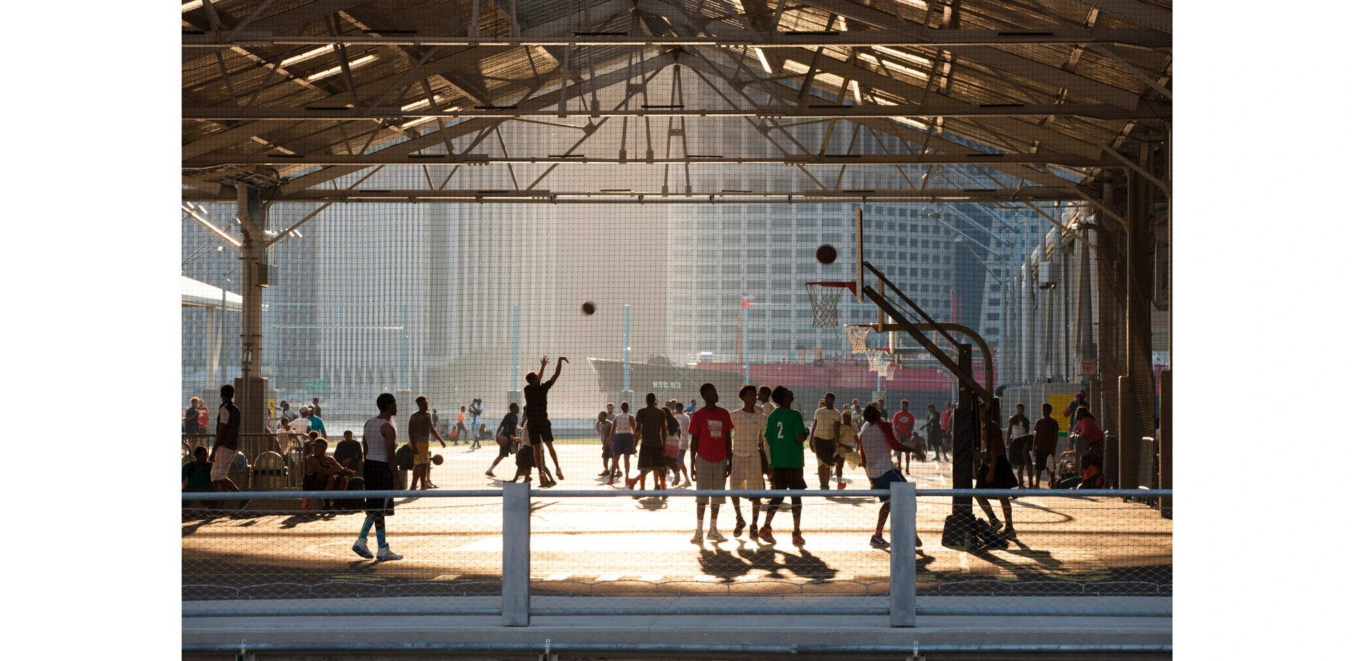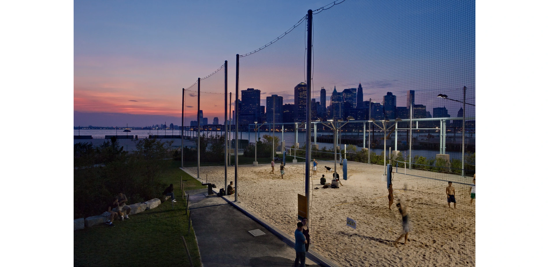 The designers focused the first phases of construction on the most critical urban connections: an existing waterfront tourist area next to the Brooklyn Bridge at Old Fulton Street, and the underdeveloped terminus of Atlantic Avenue, an important commercial corridor. Food concessions and ferry terminals at both major entrances tie the park to daily city life and help them function as "urban nodes." Frequent special events at Pier 1's large gathering spaces bring crowds and help build an audience for more everyday uses, including children's play, exercise, sunbathing, and river-viewing from a variety of new elevated prospects. At Pier 6, a 1.6-acre garden-like play space provides a regional attraction while fulfilling a growing need in the neighborhood. A fenced dog run and sand volleyball courts complete the ensemble of programs that transforms this cul-de-sac into a civic hub. Following closely on these threshold landscapes, Piers 2 and 5 were designed to maximize active recreation, satisfying a need in Downtown Brooklyn and bringing users from throughout the city to exercise and play in sublime setting of lower East River. Pier 2's three full size basketball courts, hand-ball courts, play and exercise equipment, roller rink, and multi-use turf field; plus five acres of lined turf fields at Pier 5 have kept these spaces near constant use since their opening, exposing a wider population to the park as a whole. Near a third, neighborhood-scale entry point, New Yorker's from blocks and boroughs away enjoy the city's most picturesque public grilling facility on Pier 5's 40,000-square foot Picnic Peninsula.